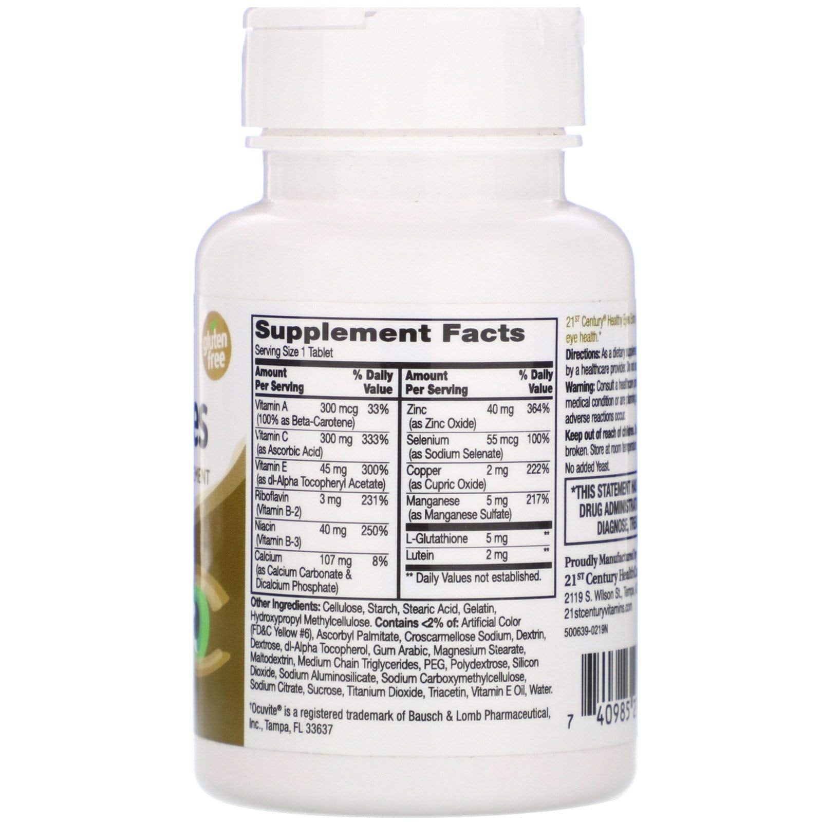 Details: 21st Century Healthy Eyes Extra with Antioxidants, Lutein, Zinc & B vitamins may help support eye health. Suggested use As a dietary supplement, adults take one (1) tablet daily with any meal or as directed by a healthcare provider. Do not exceed recommended dosage. Individual results may vary. Other ingredients Cellulose, starch, stearic acid, gelatin, hydroxypropyl methylcellulose. contains <2% of: artificial color (fd&c yellow #6), ascorbyl palmitate, croscarmellose sodium, dextrin, dextrose, dl-alpha tocopherol, gum arabic, magnesium stearate, maltodextrin, medium chain triglycerides, peg, polydextrose, silicon dioxide, sodium aluminosilicate, sodium carboxymethylcellulose, sodium citrate, sucrose, titanium dioxide, triacetin, vitamin E oil, water. Warnings Consult a healthcare provider prior to use if: pregnant, nursing, on medications, have a medical condition or are planning a medical procedure. Stop use and contact a physician if adverse reactions occur. Keep out of reach of children. Do not use if product appears to be tampered with or seal is broken. Store at room temperature.