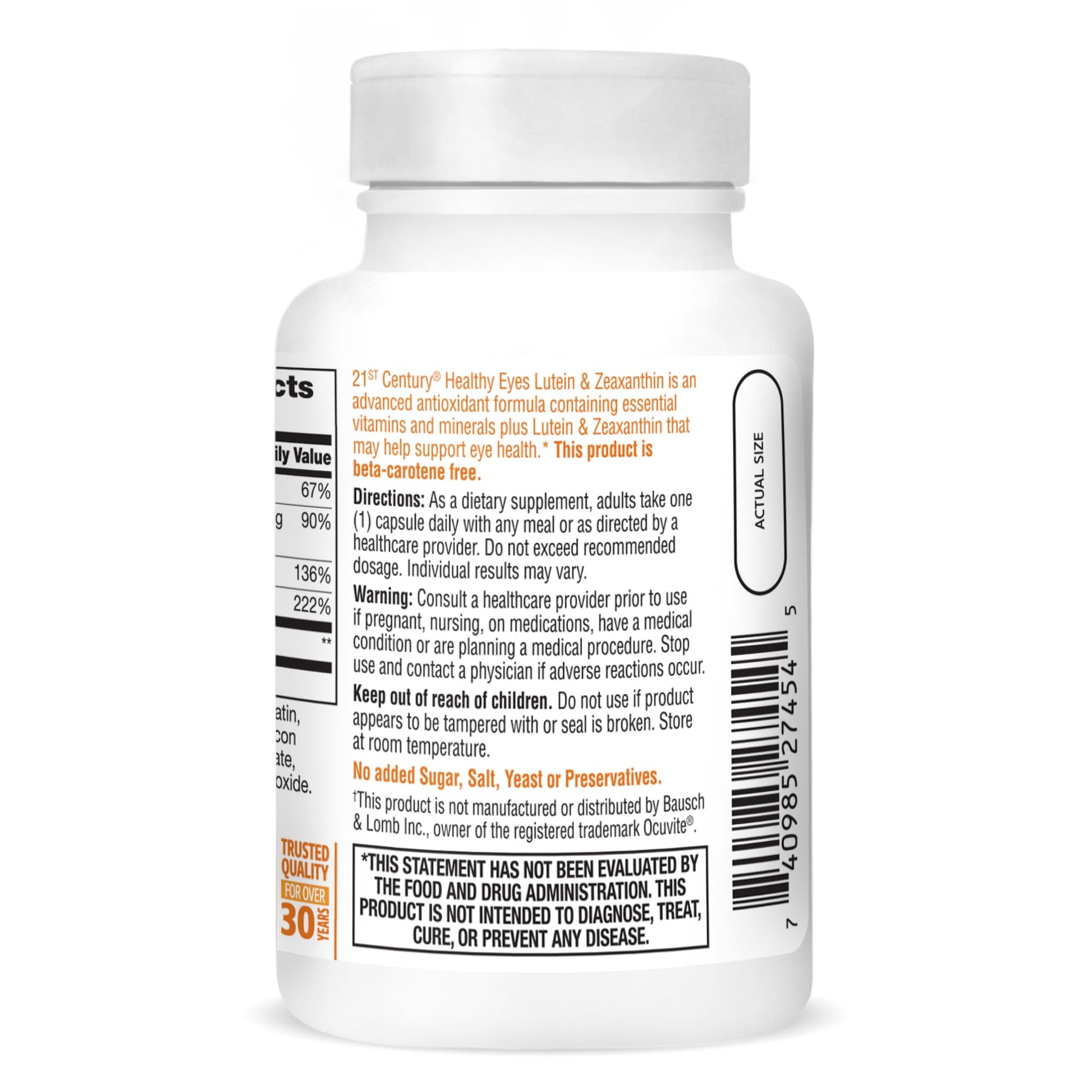 Details: Healthy eyes lutein and zeaxanthin is an advanced antioxidant formula containing essential vitamins and minerals plus lutein and zeaxanthin in amounts to support healthy eye function. Lutein and zeaxanthin are high potency phytonutrients with antioxidant benefits. Studies have shown lutein, a carotenoid, may combat environmental and hereditary effects on eye health. freshness and label potency. No added sugar, salt, yeast or preservatives. 21st century vitamins and supplements are manufactured in a camp facility under the strictest standards for product quality, including potency and purity. 21st century prides itself on providing you with a great product at the best value. This statement has not been evaluated by the food and drug administration. This product is not intended to diagnose, treat, cure, or prevent any disease. Ocuvite lutein and zeaxanthin is a registered trademark of bausch and lomb pharmaceutical inc, tampa, FL 33637.