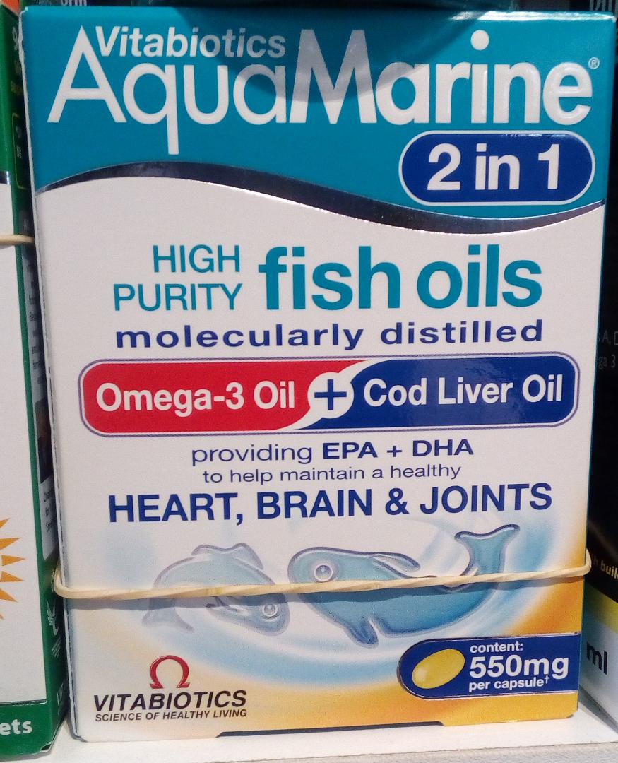 VITAMINS FOR HEART, OMEGA 3,6 ,9, VITAMINS FOR BP Aqua marine capsules contain a unique high purity marine oil formula that conveniently provides the benefits of both Omega - 3 and Cod Liver oil in a 50/50 ratio. The high -grade oils used provide rich sources of the essential fatty acids, DHA (Docosahexaenoic acid) and EPA(eicosapentaenoic acid).