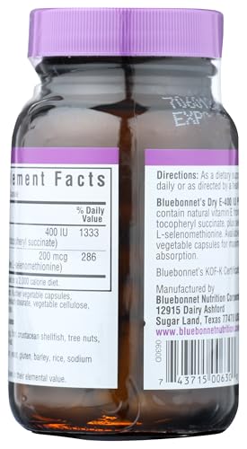 Details: Bluebonnet's Dry E-400 IU Plus Selenium Capsules contain vitamin E from oil-free d-alpha tocopheryl succinate, plus selenium from yeast-free L-selenomethionine. Available in easy-to-swallow vegetable capsules for maximum assimilation and absorption.