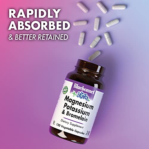 Details: Bluebonnet's Magnesium Potassium & Bromelain Vegetable Capsules are formulated with fully reacted magnesium and potassium aspartate with bromelain (2000 GDU/gram) from fresh pineapples to help support muscle health. ♦