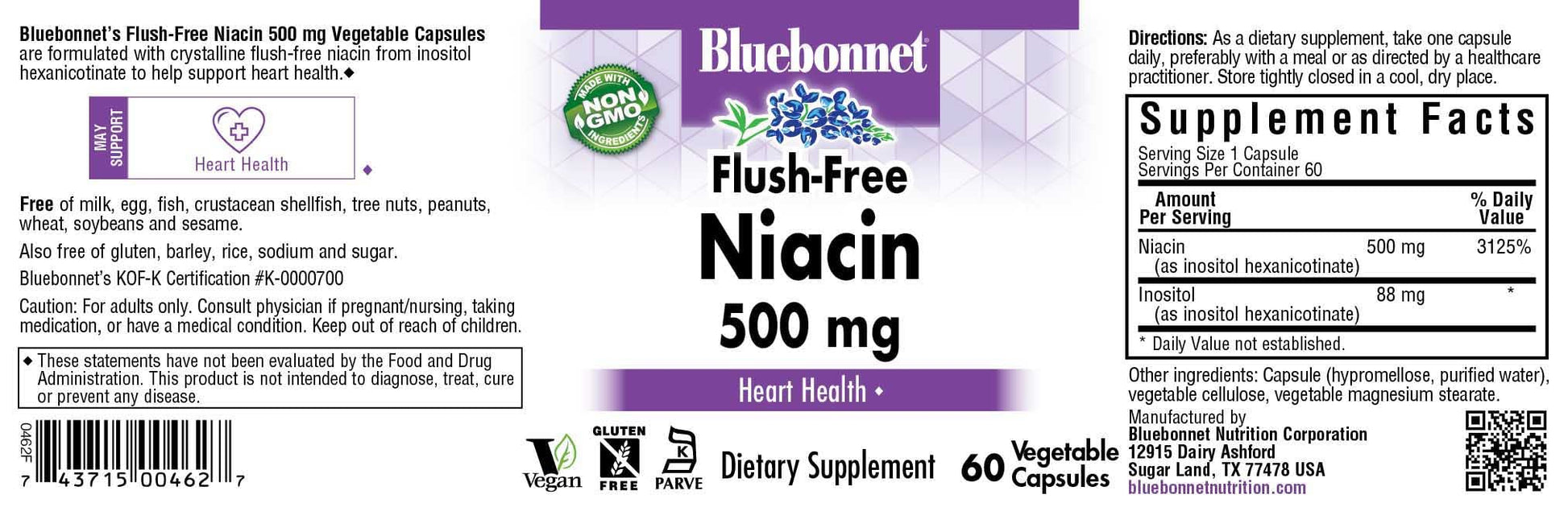 Details: Bluebonnet’s Flush-Free Niacin 500 mg Vegetable Capsules are formulated with crystalline flush-free niacin from inositol hexanicotinate to help support heart health. ♦