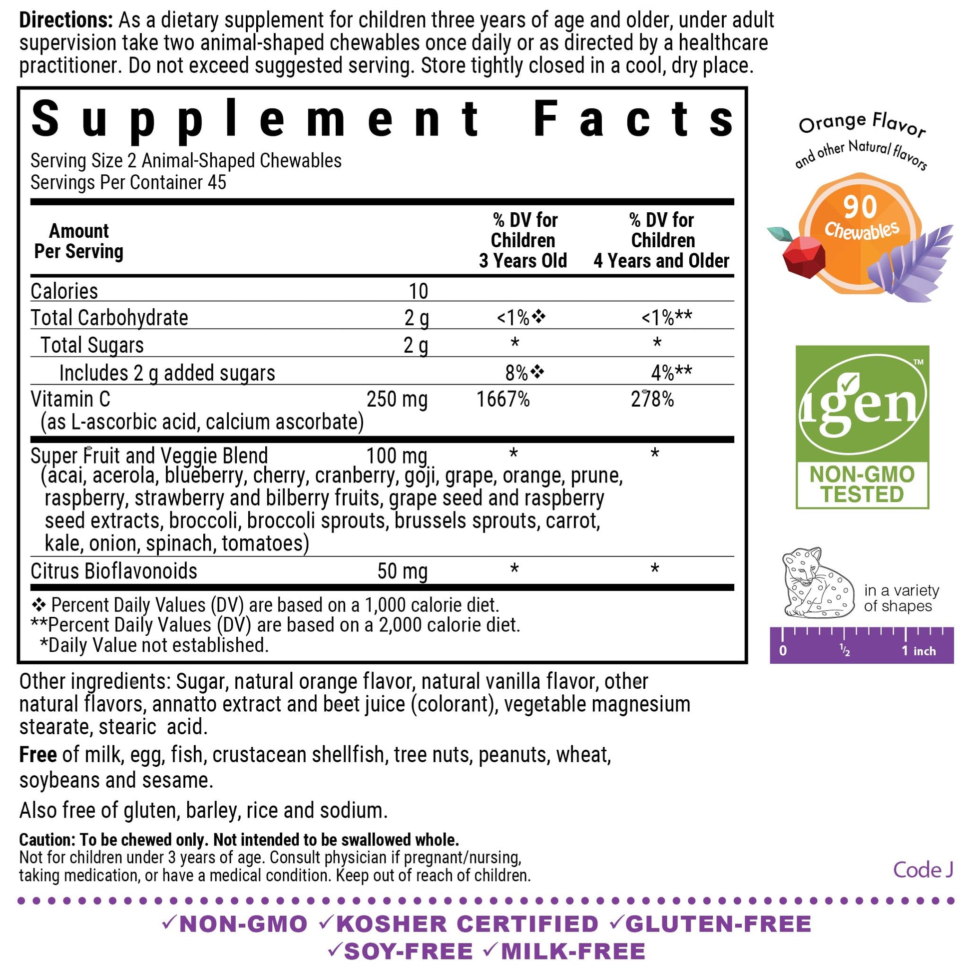 - 250 mg of Vitamin C in a base of Super Fruits and Veggies formulated for Kids!