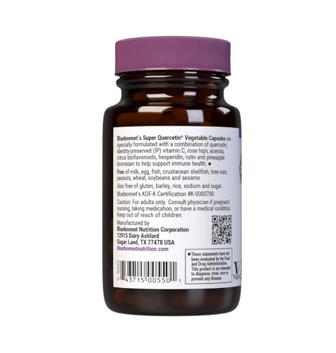 Details: Bluebonnet’s Super Quercetin Vegetable Capsules are specially formulated with a combination of quercetin, identity preserved (IP) vitamin C, rose hips, acerola, citrus bioflavonoids, hesperidin, rutin and pineapple bromelain to help support immune health. ♦