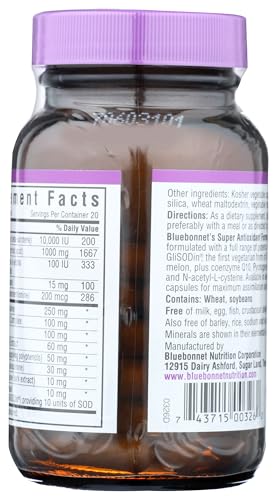 Details: Bluebonnet's Super Antioxidant Formula Vegetable Capsules are specially formulated with a full range of potent antioxidants, including GliSODin, the first vegetarian form of SOD from canteloupe melon, coenzyme Q10, Pycnogenol, red wine polyphenols and N-acetyl-L-cysteine. ♦