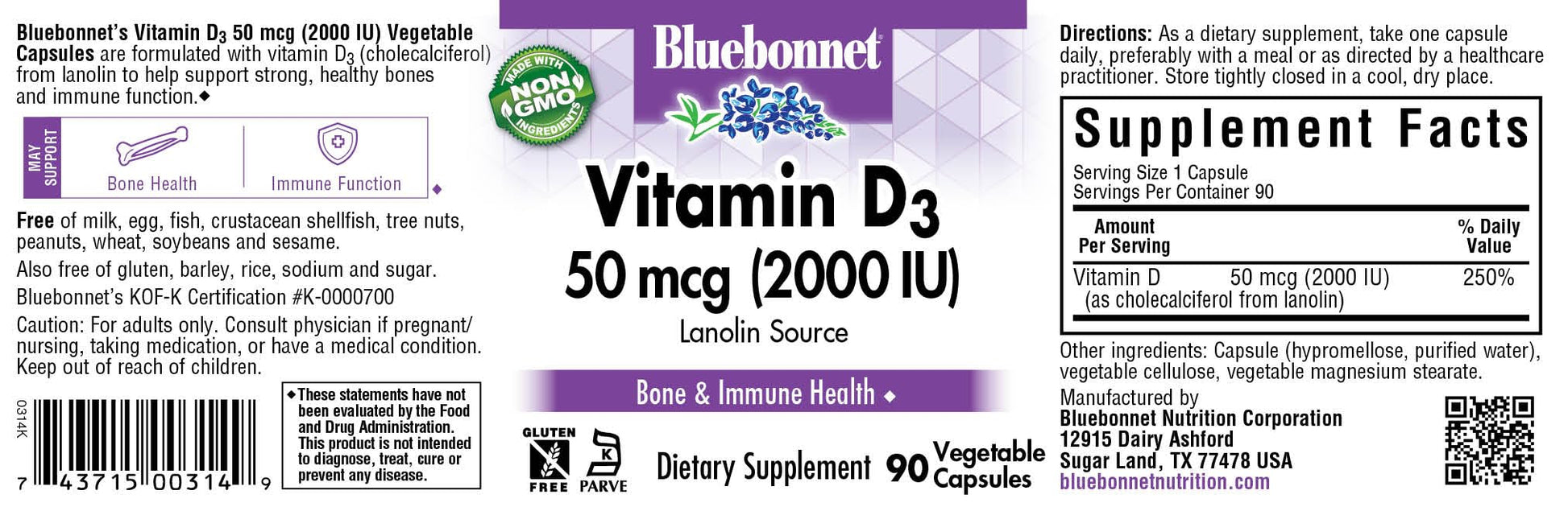 Details: Bluebonnet's Vitamin D3 50 mcg (2000 IU) Vegetable Capsules are formulated with vitamin D3 (cholecalciferol) from lanolin to help support strong, healthy bones and immune function. ♦