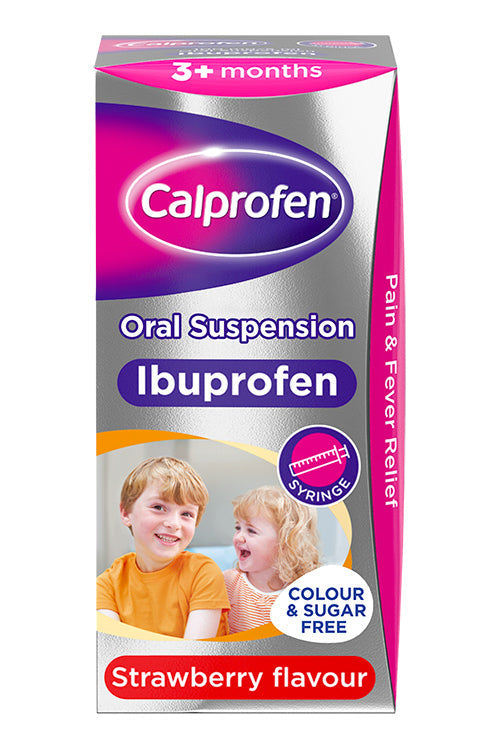 Our CALPROFEN® Suspension contains ibuprofen, which starts to work on a fever in just 15 minutes and lasts for up to 8 hours. It can be used for pain relief, to reduce your child’s temperature, and to relieve the symptoms of cold and flu. Each pack comes with an easy dose syringe.