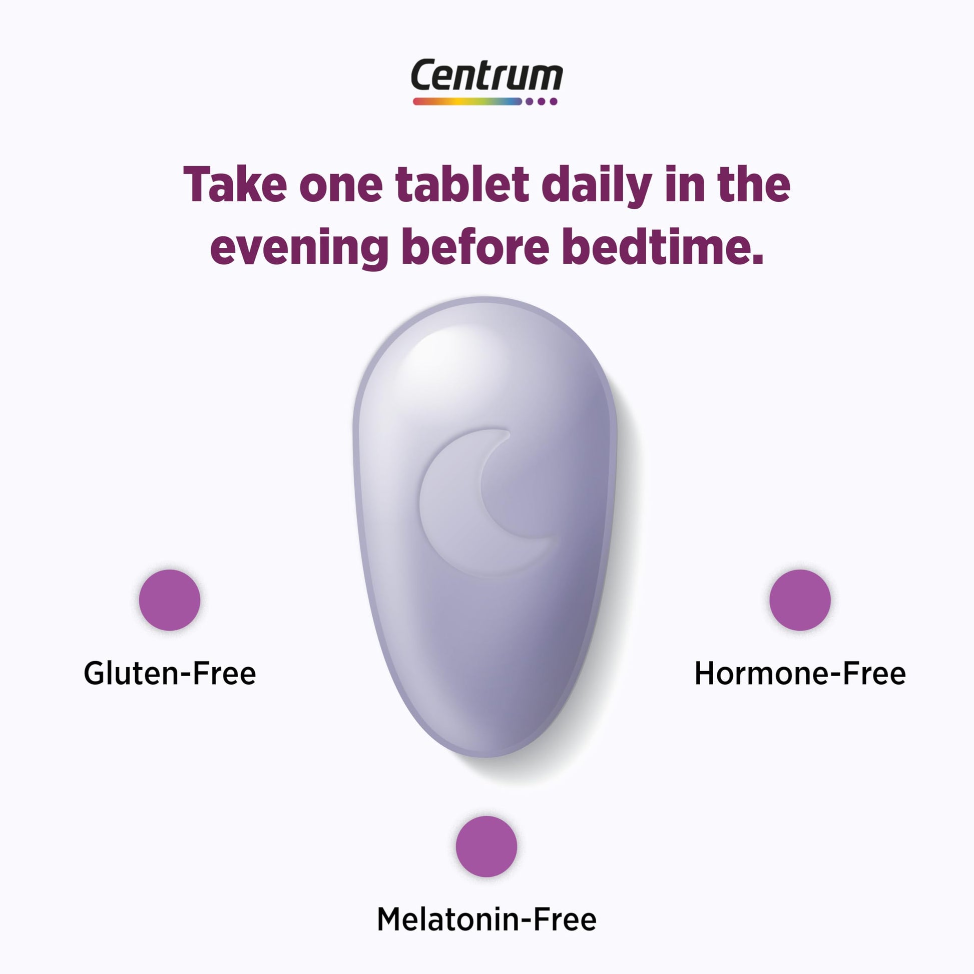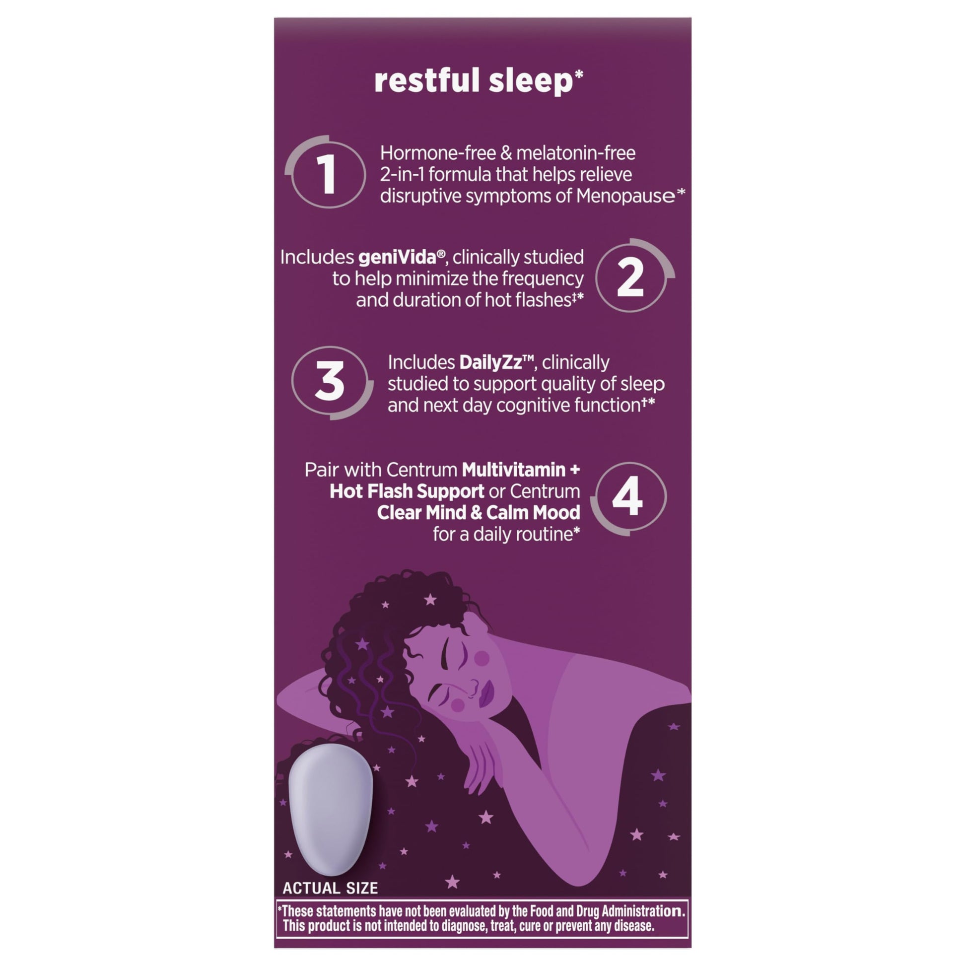 Details: Take charge of your menopause journey with Centrum Menopause Support dietary supplements, specially designed to help relieve the disruptive symptoms of menopause. Centrum Restful Sleep Menopause Supplement helps reduce sleep disruptions caused by hot flashes and helps you to feel refreshed and focused for a better tomorrow. The two-in-one formula includes clinically studied: DailyZz (TM), a blend of botanical extracts to support quality of sleep (2), and geniVida (R) to help reduce hot flashes (1). geniVida (R), a synthetic form of genistein, mimics estrogen's role in the body to help reduce the frequency and duration of hot flashes.* (1) geniVida (R) is a trademark of DSM. A Clinical Study showed a significant reduction of hot flashes after 12 weeks of daily use of geniVida (R)* (2) DailyZz (TM) is a trademark of Kemin Industries, Inc. A Clinical Study showed improvement in quality of sleep and next day cognitive function after 30 days of nightly use of DailyZz (TM)* * These statements have not been evaluated by the Food and Drug Administration. This product is not intended to diagnose, treat, cure or prevent any disease. IQVIA: Claim substantiation Validation Statement. July 2023