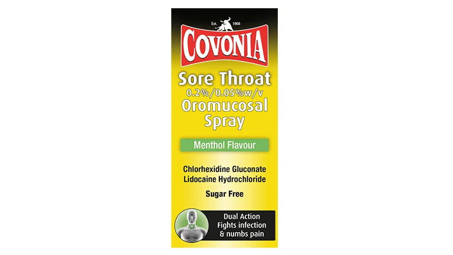 Covonia Sore Throat Oromucosal Spray eases the symptoms of painful, irritated sore throats and contains chlorhexidine, an antiseptic and lidocaine which is a local pain killer.