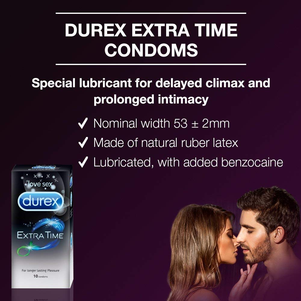 Enhance the intimacy of your special moments with the Durex Extra Time condoms. These condoms contain special climax-control lubricant, benzocaine, that helps him last longer while providing the same level of reassurance and protection as a regular condom. The condoms also smell better which helps avoid unpleasant distractions and you can relax and enjoy to the fullest. Each Durex condom is dermatologically tested to ensure strength and a high level of protection. No method of contraception can give you 100% protection against pregnancy, HIV or sexually transmitted infections. Please read the instructions, especially when using condoms for anal or oral sex. Try different Durex condoms or indulge in Durex’s Play range of lubricants and ring to make love-making comfortable and exciting!