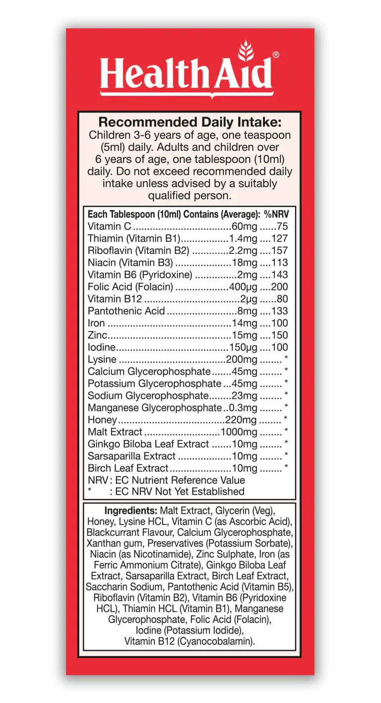 Malt Extract, Glycerine (Veg), Honey, Lysine HCL, Vitamin C (As Ascorbic Acid), Blackcurrant Flavour, Calcium Glycerophosphate, Xantham Gum, Preservatives (Potassium Sorbate), Niacin (as Nicotinamide), Zinc Sulphate, Iron (as Ferric Ammonium Citrate), Ginkgo Biloba Leaf extract, Sarsaparilla Extract, Birch Leaf Extract, Saccharin Sodium, Pantothenic Acid (Vitamin B5), Riboflavin (Vitamin B2), Vitamin B6 (Pyridoxine HCl), Thiamine HCl (Vitamin B1), Manganese Glycerophosphate, Folic Acid (Folacin), Iodine (Potassium Iodide), Vitamin B12 (Cyanocobalamin).