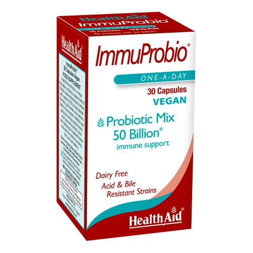 ImmuProbio is a unique formulation containing a superior blend of 50 billion viable bacterial strains, fortified with a prebiotic (FOS), to help replenish the body’s good bacteria. A balanced gut bacterium contributes to a healthy immune and nervous system. Regulation of digestion issues are complimented by a healthy diet and supplemented with probiotics. A healthy gut bacteria balance could contribute to the body’s recognition of allergens and support the proper reaction and reduce unnecessary exaggeration of an immune response. HealthAid uses special acid & bile resistant strains, which prevent the stomach juices destroying the ingredients before they reach the intestines, ensuring their purity and potency.