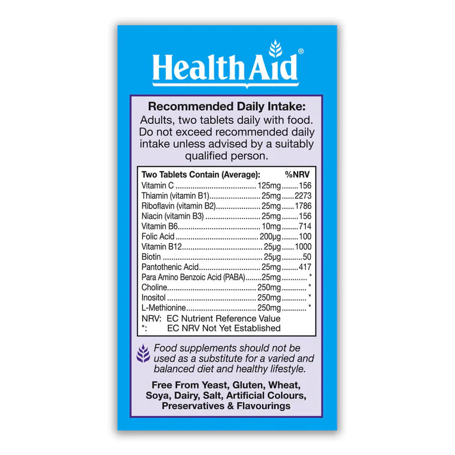 Bulking Agent (di-calcium phosphate, microcrystalline cellulose), Inositol, L-Methionine, Choline Bitartrate, Vitamin C (ascorbic acid), Thiamin (thiamin HCL), Pantothenic Acid (calcium pantothenate), Riboflavin (vitamin B2), Niacin (nicotinamide), Para Amino Benzoic Acid (PABA), Anti-caking Agent (silica, veg. magnesium stearate), Vitamin B6 (pyridoxine HCL), Glazing Agent [hydroxyl propyl methyl cellulose (HPMC), glycerine], Folic Acid, Biotin, Vitamin B12 (cyanocobalamin).