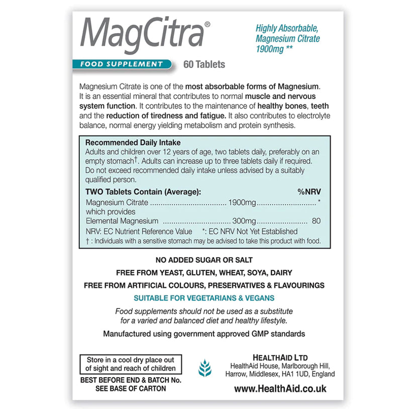 Magnesium Citrate is a form of Magnesium that is bound to a citrate molecule and is regarded as one of the most absorbable forms of Magnesium. MagCitra tablets provide 300mg of elemental Magnesium. The word “elemental” refers the amount of Magnesium actually absorbed by the body.