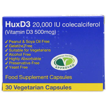 Directions: take one capsule every two weeks or as directed by your healthcare professional. These easy to swallow capsules can be chewed or burst open, the contents are flavour free. HuxD3 should be taken with the largest meal of the day to ensure maximum absorbtion.