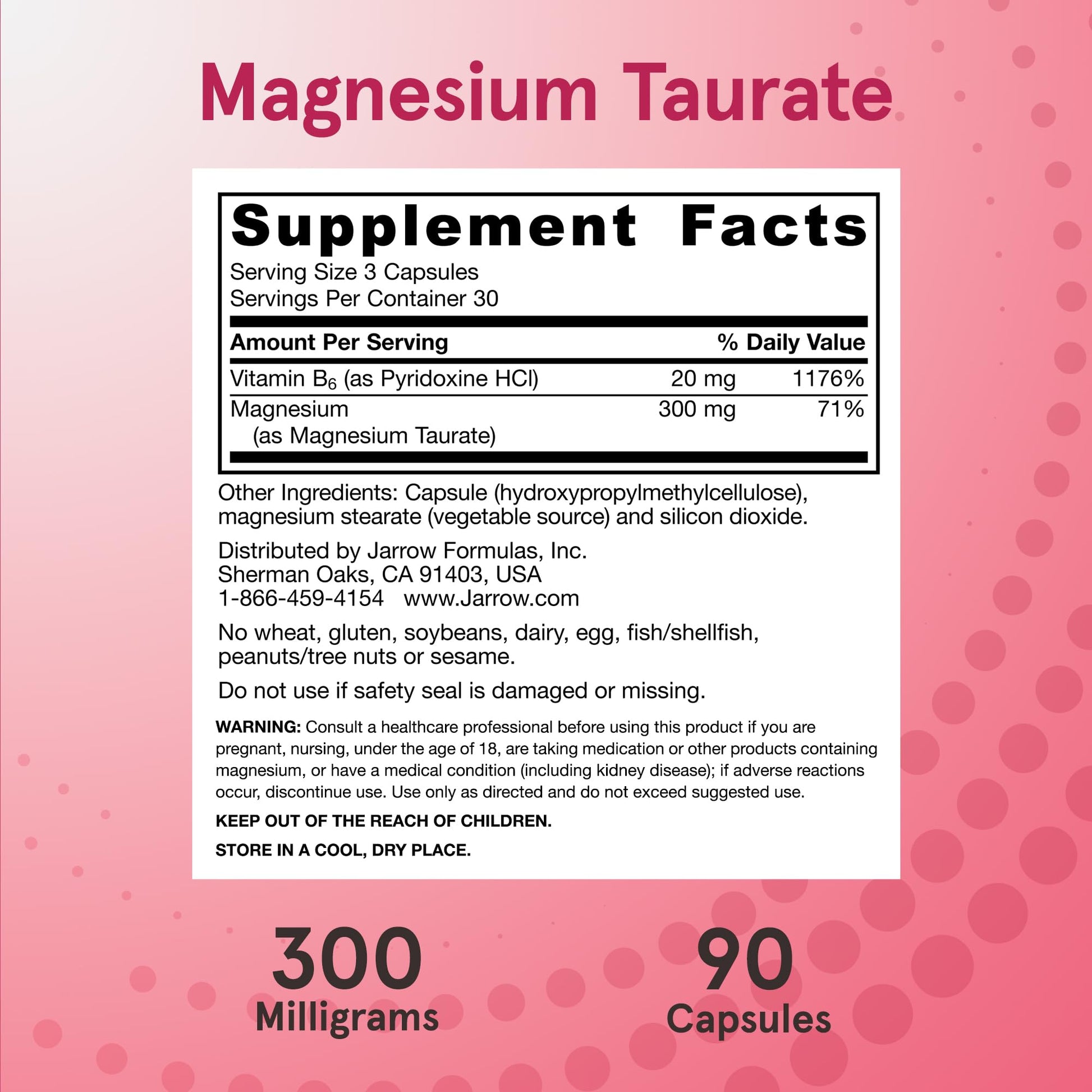 Pre-Order | Arrives in 5–10 Days – Jarrow Formulas Magnesium Taurate, Dietary Supplement, Supports Cardio and Bone Health, 300 mg per Servings, 90 Veggie Capsules, Up to a 30 Day Supply
