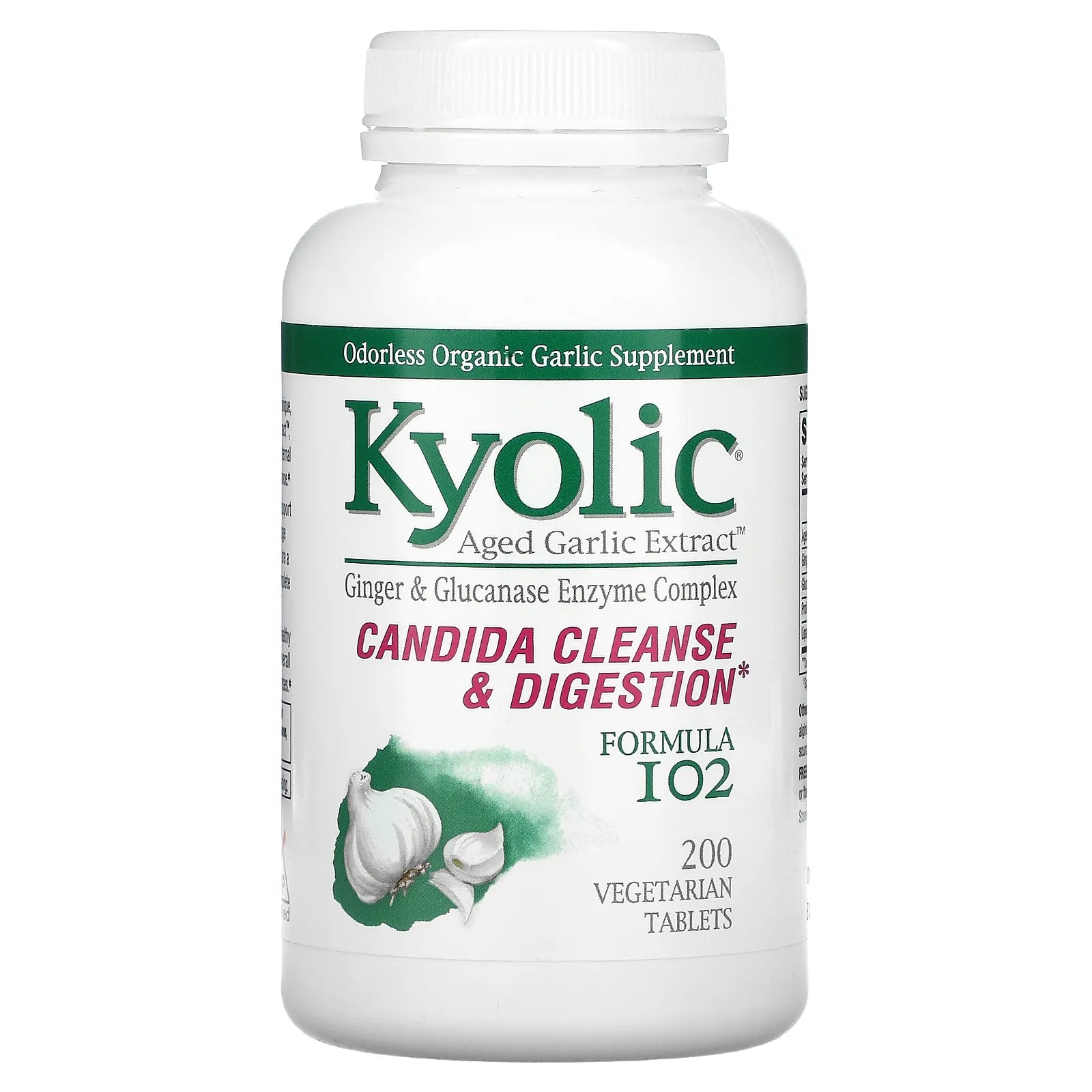 Kyolic® Formula 102 herb & enzyme blend, contains a unique, natural and synergistic combination of Aged Garlic Extract™, Ginger, Glucanase, Lipase and Protease to support internal cleansing, healthy intestinal function and digestive balance.