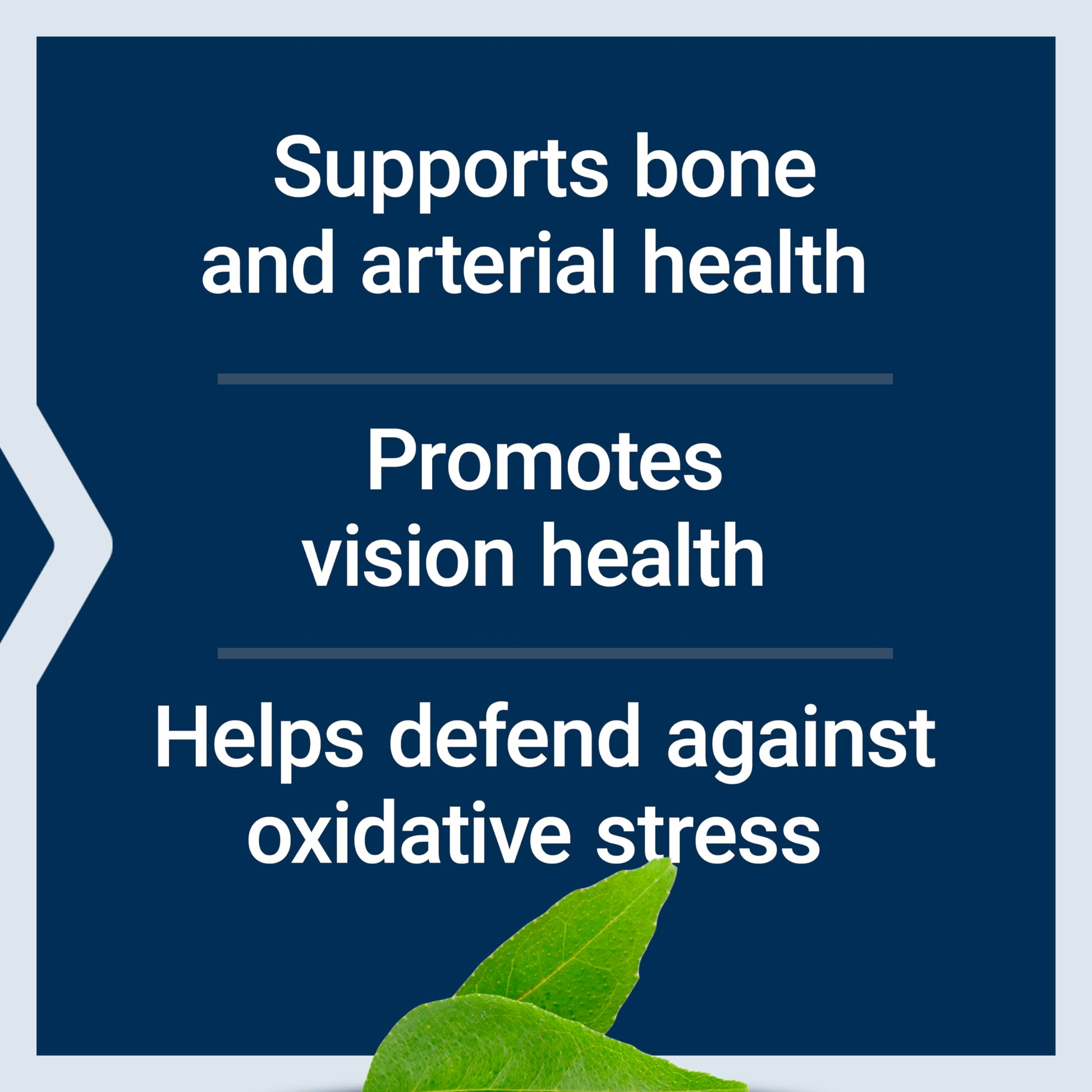 - Boost bone and heart health – Vitamin K1 and two forms of K2 support optimal bone and heart health by encouraging a healthy calcium balance in your bones and arteries, and vitamin E helps protect against cellular stress caused by free radicals.