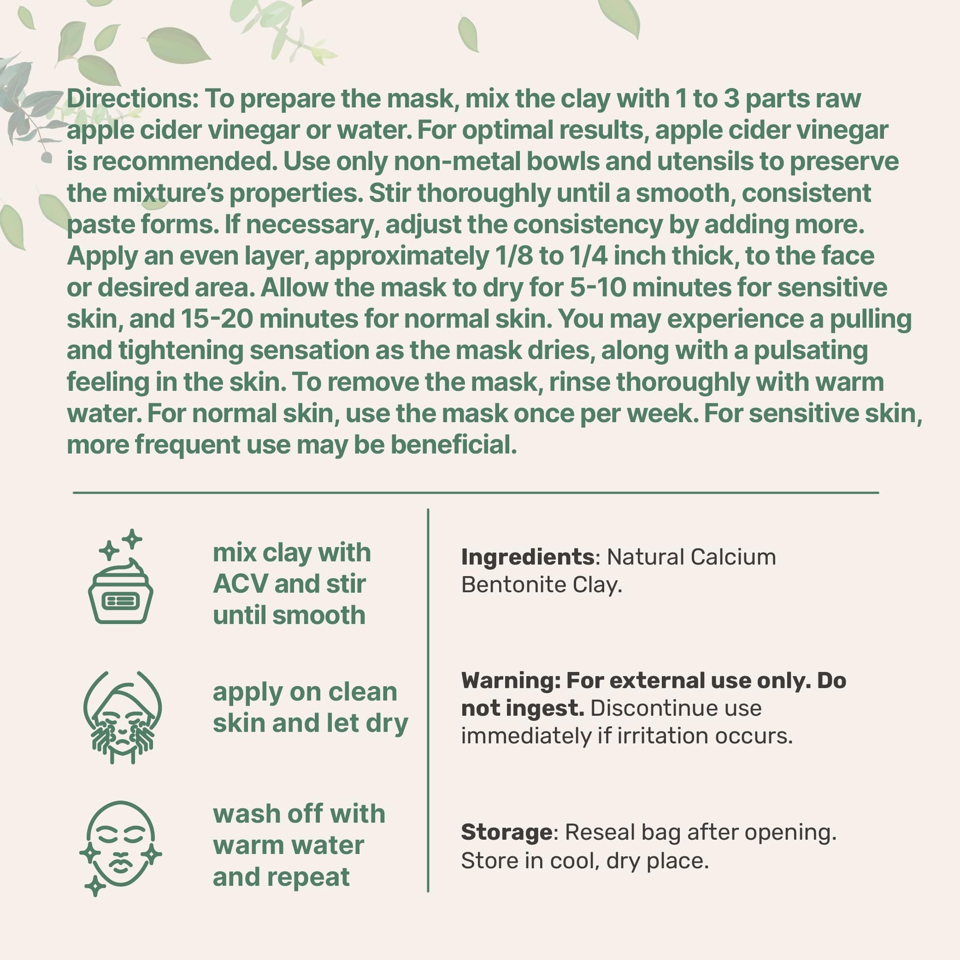 - Each pouch provides 2 pounds of Natural Calcium Bentonite Clay, which calcium bentonite is known to offer gentle absorption on the skin and should be used for external use only.