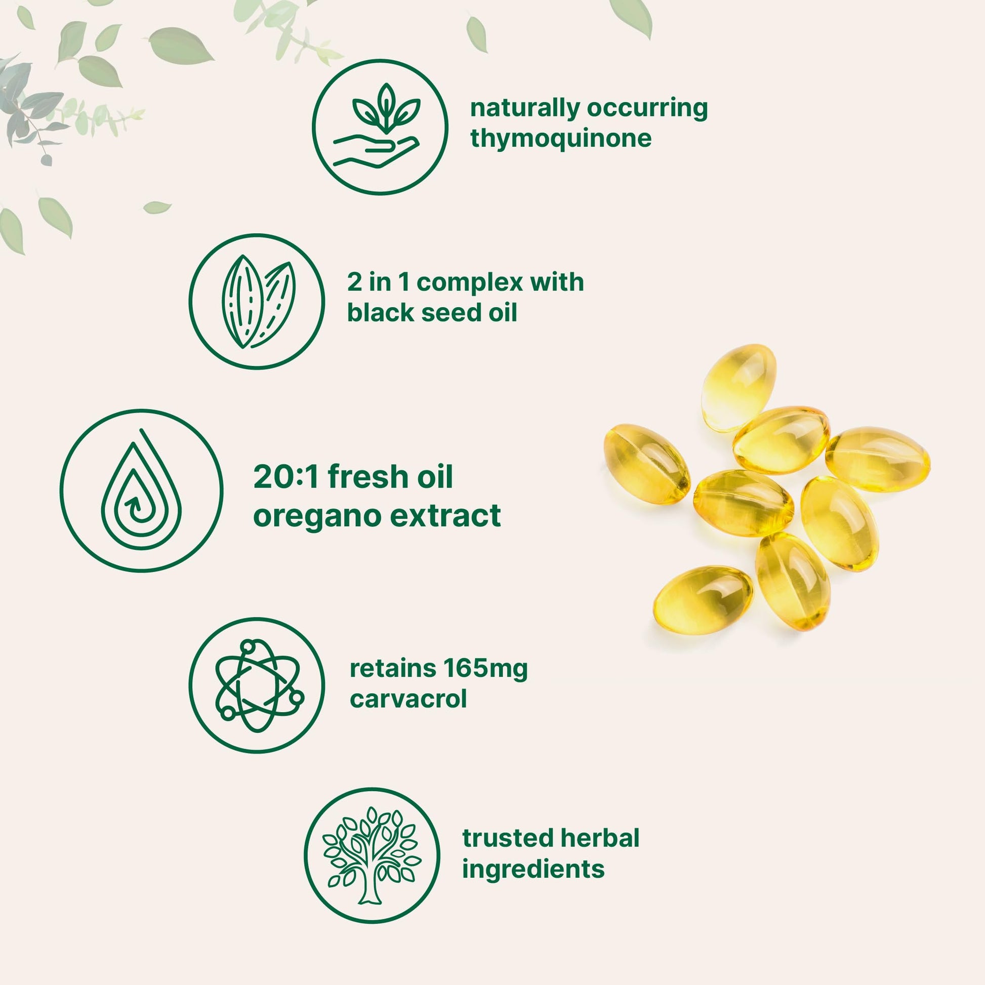 - Elevate your wellness routine with our fresh Oil of Oregano and Black Seed Oil complex, a premium quality supplement that promotes seasonal immune health and harnesses the power of nature's finest gifts.
