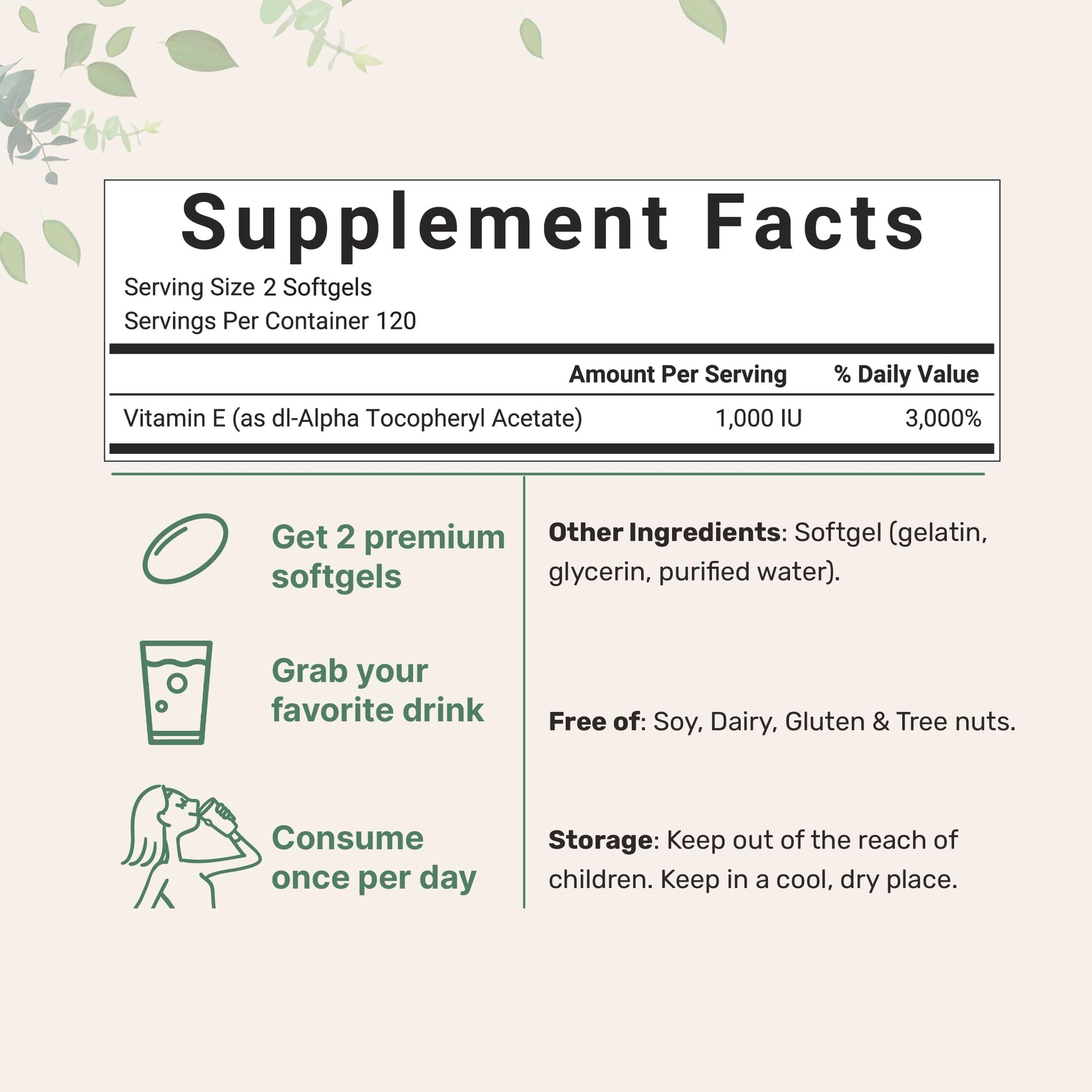 - Premium non-GMO and non-irradiated vitamin E. Made without soy, dairy, gluten, flavors, artificial colors, and tree nuts. Ingredients must pass our 3rd party lab tests to ensure a product that is safe, pure, and potent.