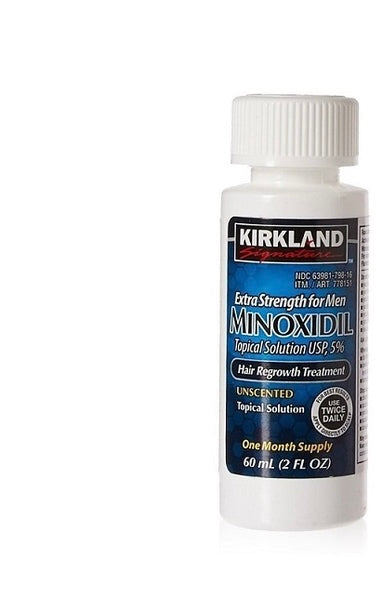 Kirkland Signature™ Extra Strength for Men Minoxidil Topical Solution USP, 5% Hair Regrowth Treatment regrows more hair than 2% Minoxidil Topical Solution. Results may occur at 2 months. Kirkland Signature™ Extra Strength for Men Minoxidil Topical Solution USP, 5% Hair Regrowth Treatment is for men who have a general thinning of hair on the top of the scalp. Not intended for frontal baldness or a receding hairline. Some people may experience a dry, itchy scalp and irritation.