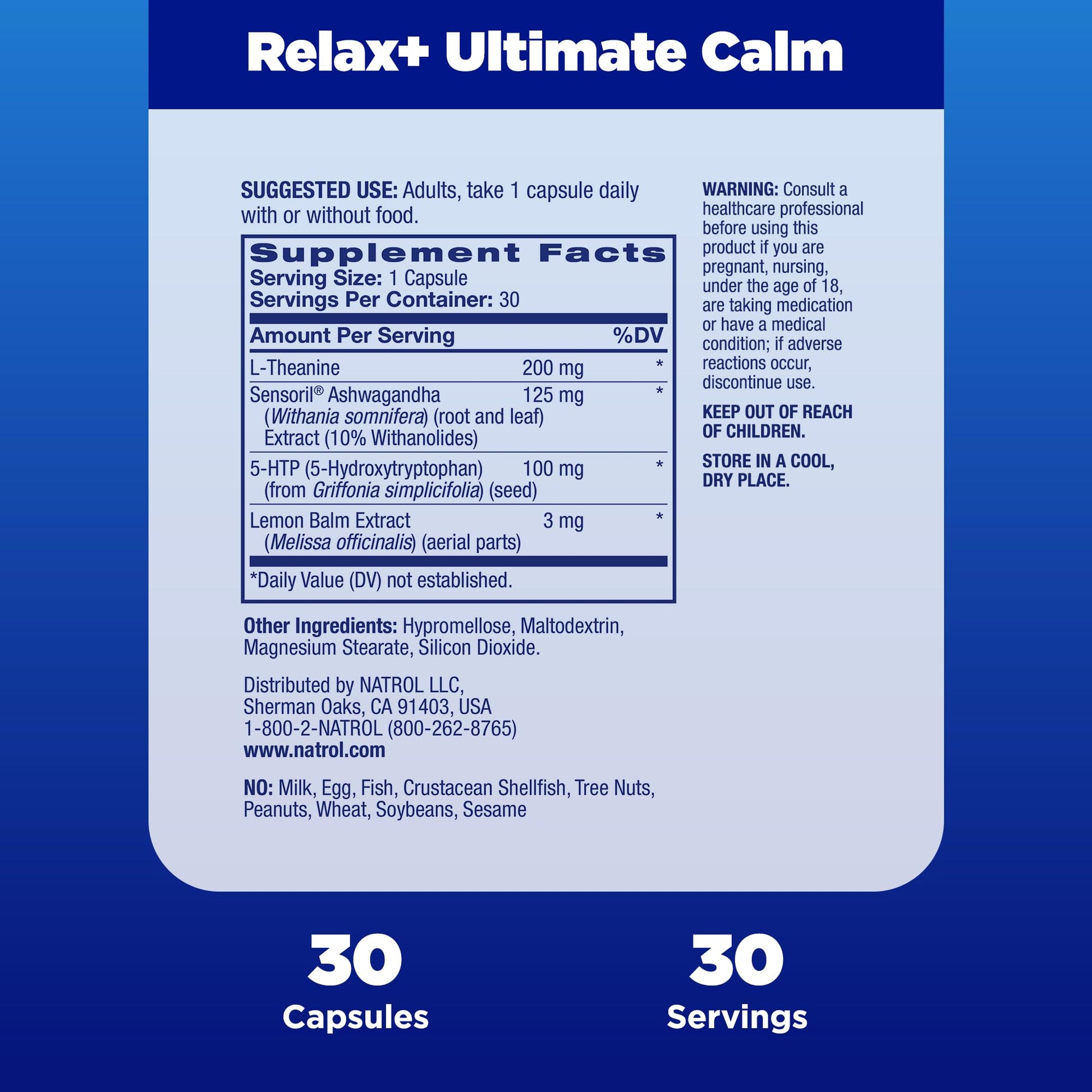 - Dietary Supplement: One 30 count bottle of Natrol Relax+ Ultimate Calm Capsules for a 30-day supply