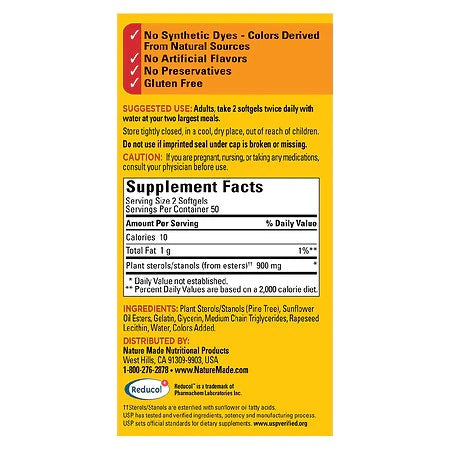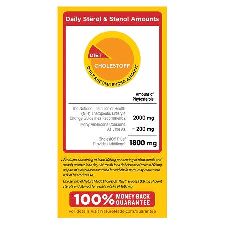 A healthy cholesterol level is an important part of heart health.(1) CholestOff Plus is formulated with esterified sterols and stanols instead of free form sterols and stanols that are formulated in CholestOff Original. The esterified sterols and stanols have been clinically proven to have cholesterol-lowering benefits.(1) Additionally, Nature Made has conducted clinical trials examining the effects of CholestOff Plus on cholesterol. Our studies show that consuming CholestOff Plus in addition to following the National Institutes of Health's National Cholesterol Education Program (NCEP) Therapeutic Lifestyle Changes (TLC) diet, reduced LDL cholesterol levels.(1) (1)Products containing at least 400 mg per serving of plant sterols and stanols, eaten twice a day with meals for a daily intake of at least 800 mg as part of a diet low in saturated fat and cholesterol, may reduce the risk of heart disease. One serving of Nature Made CholestOff Plus supplies 900 mg of plant sterols and stanols for a daily intake of 1,800 mg.