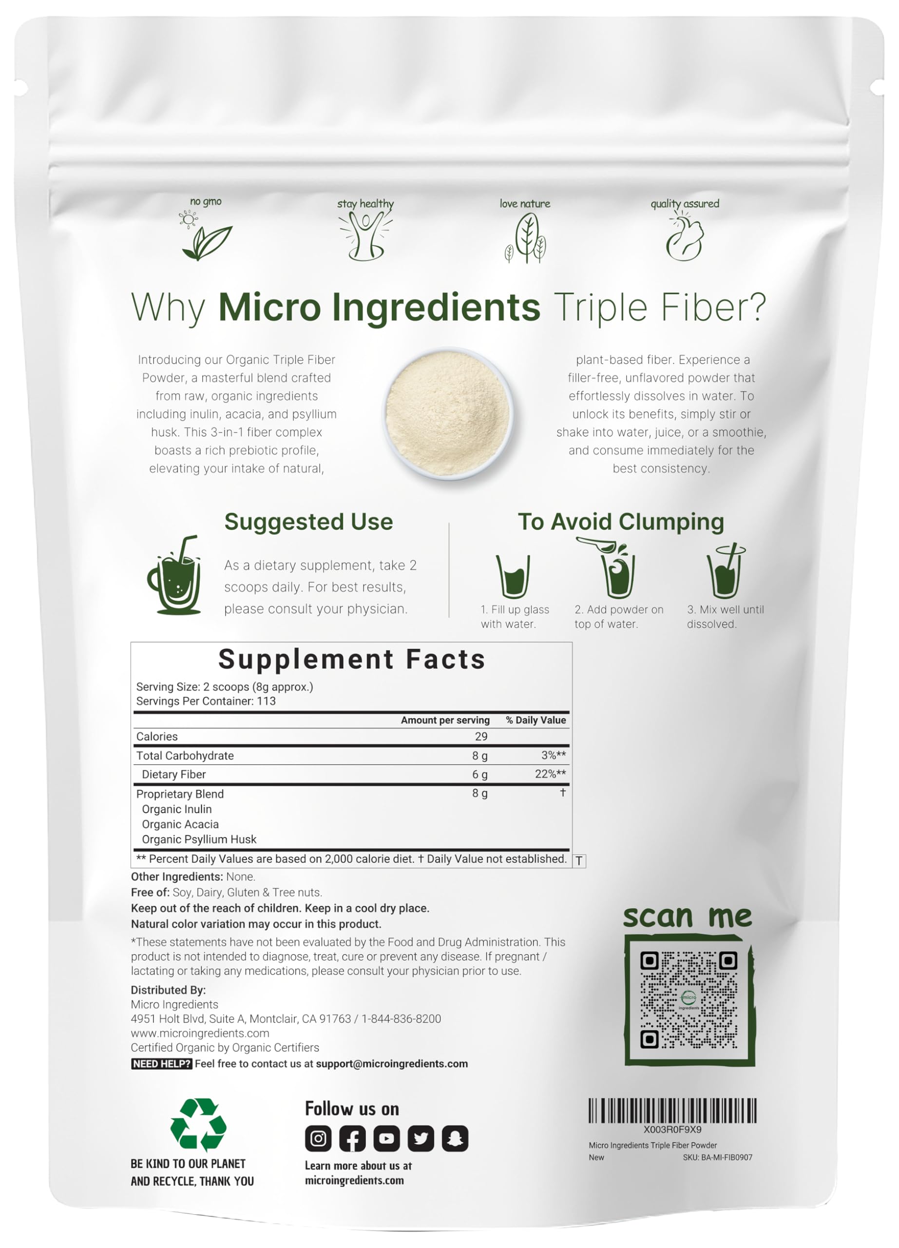 - Organic Triple Soluble Fiber Powder (Chicory Root Inulin Fiber, Acacia Fiber and Psyllium Husks Fiber Blend 3 in 1 Complex Formula), 2 Pounds (32 Ounce), Daily Fiber Advanced Powder, Unflavored, Hunger Control and Vegan Friendly.