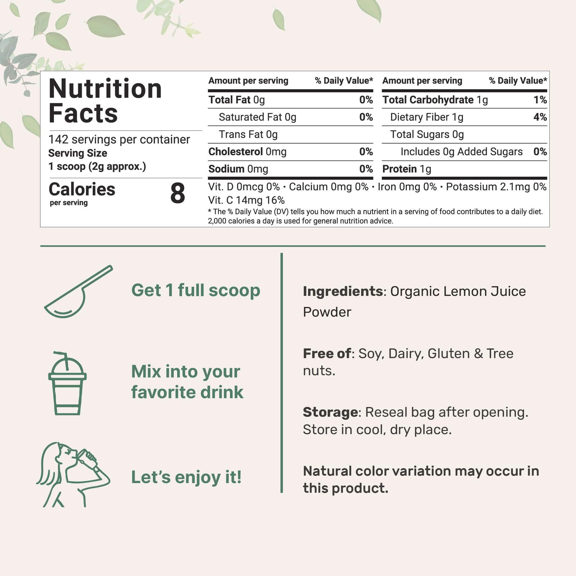 - Each pouch contains 10 ounces of lemon juice powder, 1 scoop serving size equals approx. 2g, lasts up to a 142 day supply.