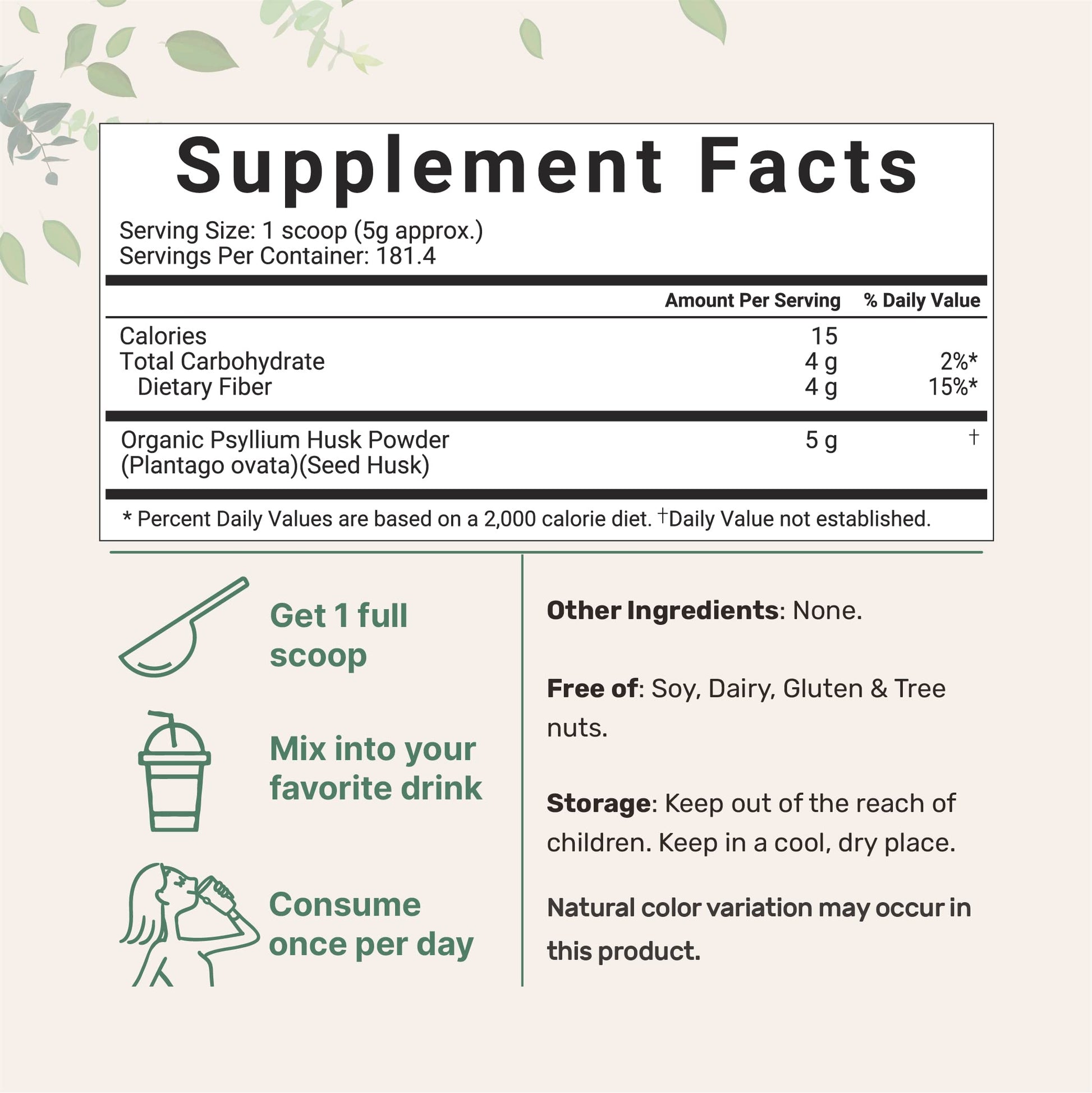 - Each pouch contains a 2-pound bulk supply of pure psyllium husk powder for baking and drinking while also being rich in vegan dietary fiber. Totals 181 servings of unflavored natural-herbal ingredients.