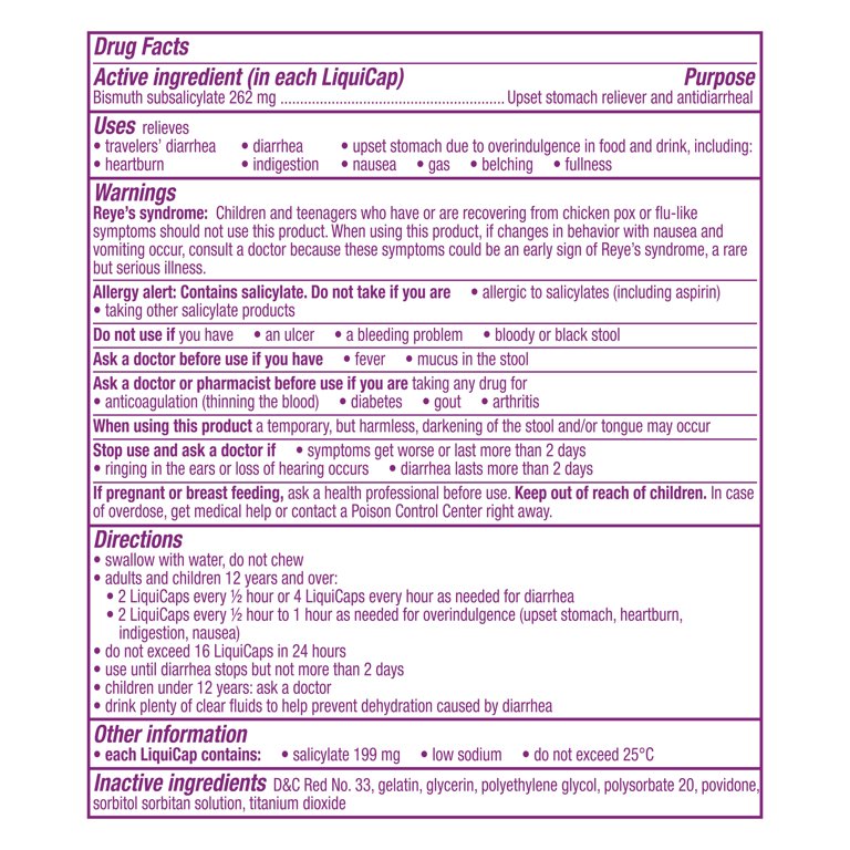 Active Ingredient (in each LiquiCap): Bismuth Subsalicylate 262 mg (Upset Stomach Reliever and Antidiarrheal) ,Inactive Ingredients: D&C Red No. 33, Gelatin, Glycerin, Polyethylene Glycol, Pharmaceutical Ink, Polysorbate 20, Povidone, Sorbitol Sorbitan Solution, Titanium Dioxide