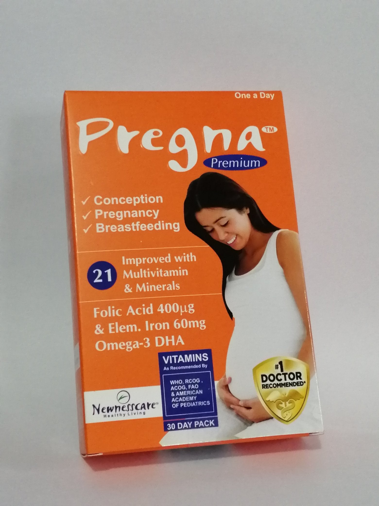 Pregna Premium Pregnancy supplement, folic acid 400µg, elemental iron 60mg and omega-3. Conception, Pregnancy and Breastfeeding. Improved with 21 Multivitamin and Minerals.