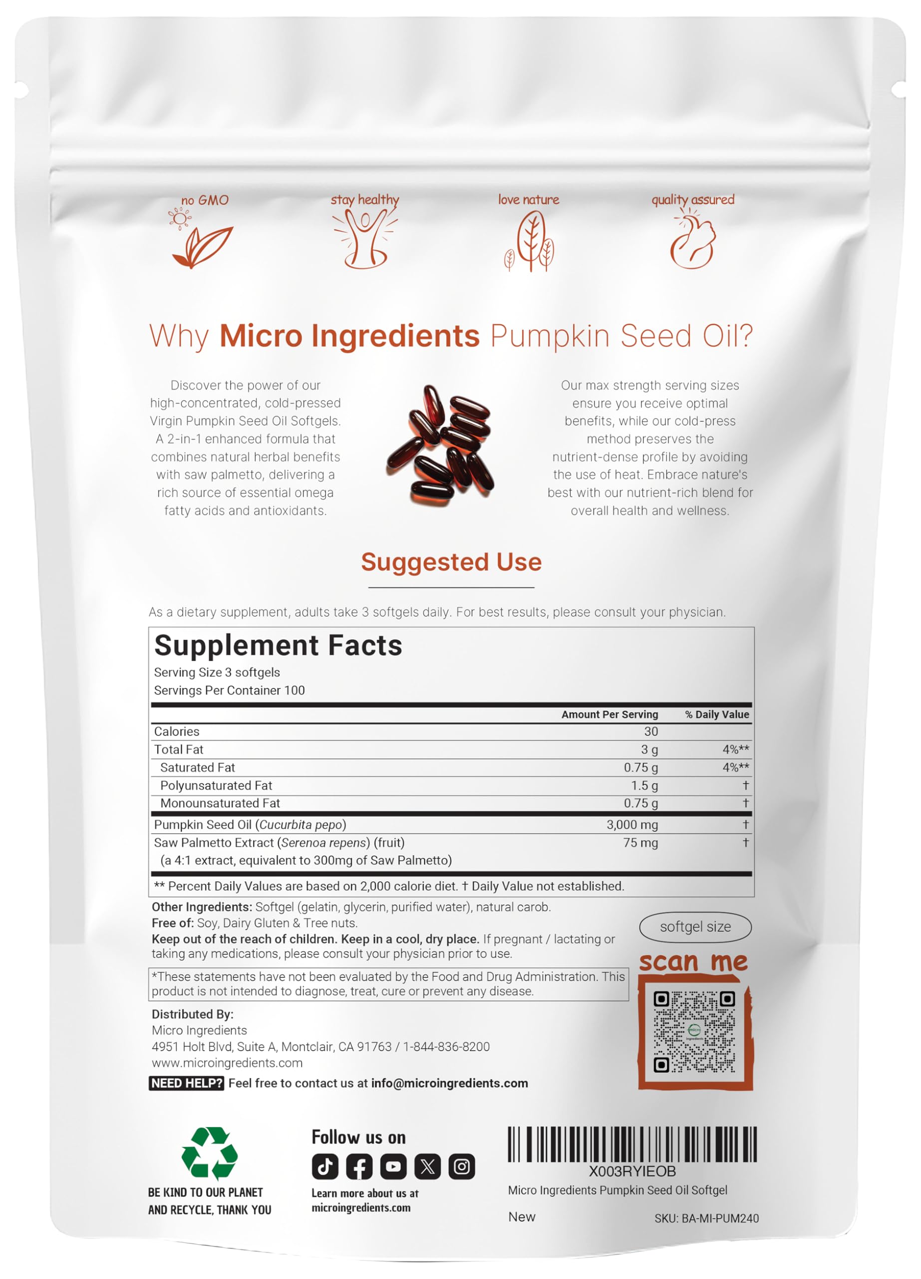 - Micro Ingredients offers max strength virgin pumpkin seed oil softgels, high concentrated cold-pressed ingredients, 2-in-1 complex with saw palmetto extract, retains essential fatty acids, phytosterols, and antioxidants.