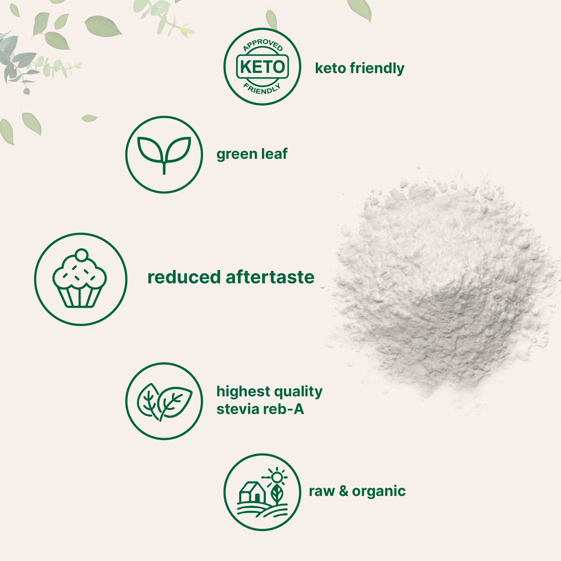- Pure Organic Stevia in the Raw (Stevia Green Leaf Extract Powder Rebaudioside A (Reb-A)), 4 Ounce, Reduced Bitter Aftertaste , Keto Diet and Vegan Friendly.