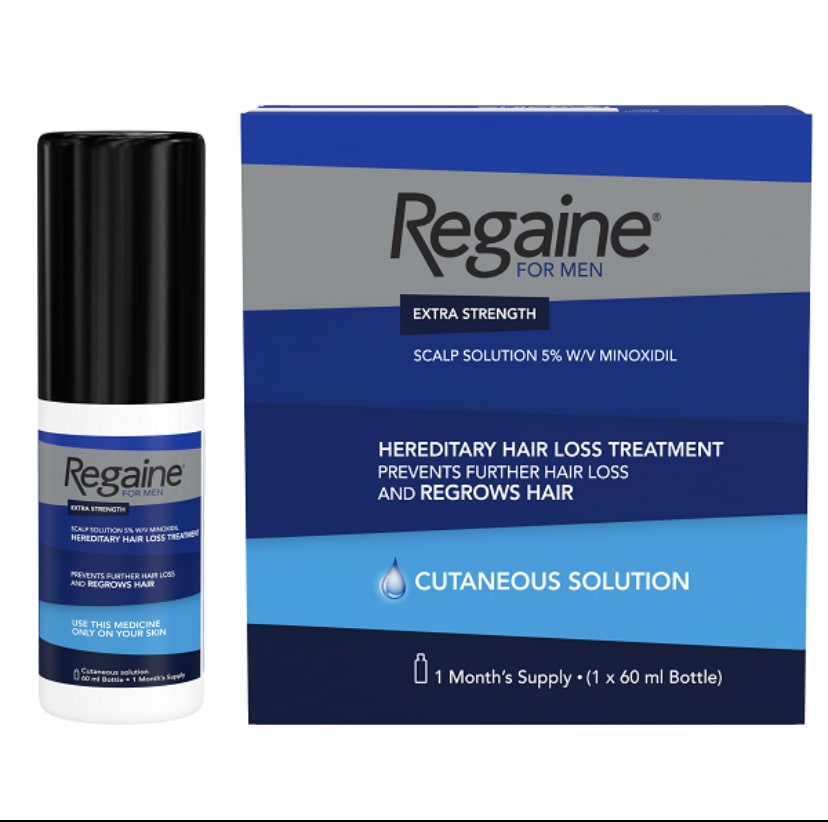 Minoxidil 5 per cent scalp solution. Hereditary hair loss treatment. Prevents further hair loss and regrows hair. Uses: For the treatment of hereditary hair loss in men. Is Regaine for men extra strength suitable for your type of hair loss. Regaine for men extra strength is for men with a family history of hair loss who have a general thinning of hair at the top of the scalp (vertex). Regaine for men extra strength is more likely to re-grow hair in men with the range of thinning hair or hair loss as shown on the pack. If you have more hair than shown on the pack, Regaine for Men Extra Strength may not work.