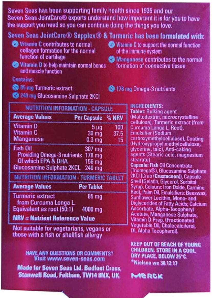 The only product to combine Turmeric extract with Glucosamine & Omega-3. Seven Seas JointCare Supplex & Turmeric has been formulated with: Vitamin C contributes to normal collagen formation for the normal function of bones and cartilage Vitamin D to help maintain normal bones Vitamin C to support the normal function of the immune system Manganese contributes to the normal formation of connective tissue