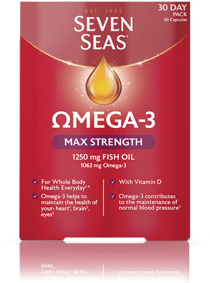 Omega-3 Max Strength contains 1063 mg Omega-3. Omega 3 helps maintain the health of your heart1, brain2, eyes2 and blood pressure5. It also contains the UK government recommended 10 μg of Vitamin D. Vitamin D supports the health of your bones3 and immune system4.