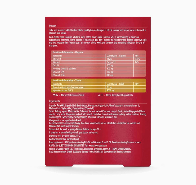 - CONTENTS: 1x Seven Seas Omega-3 Fish Oil & Turmeric, With Omega-3, EPA and DHA, + Vitamin D, For Whole Body Health+, 30 One-A-Day capsules, 1 month supply