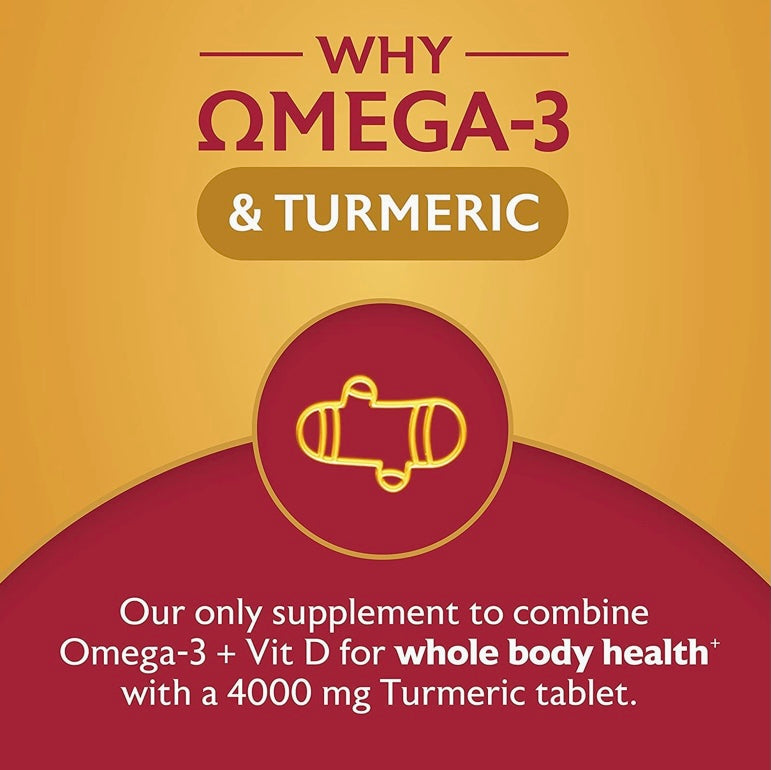 - INGREDIENTS: One capsule contains 500 mg Fish Oil, 300 mg Omega-3, and the tablet contains 4000 mg Turmeric (as 85 mg extract); Whole body health+ support with Omega 3, EPA & DHA, and Vitamin D