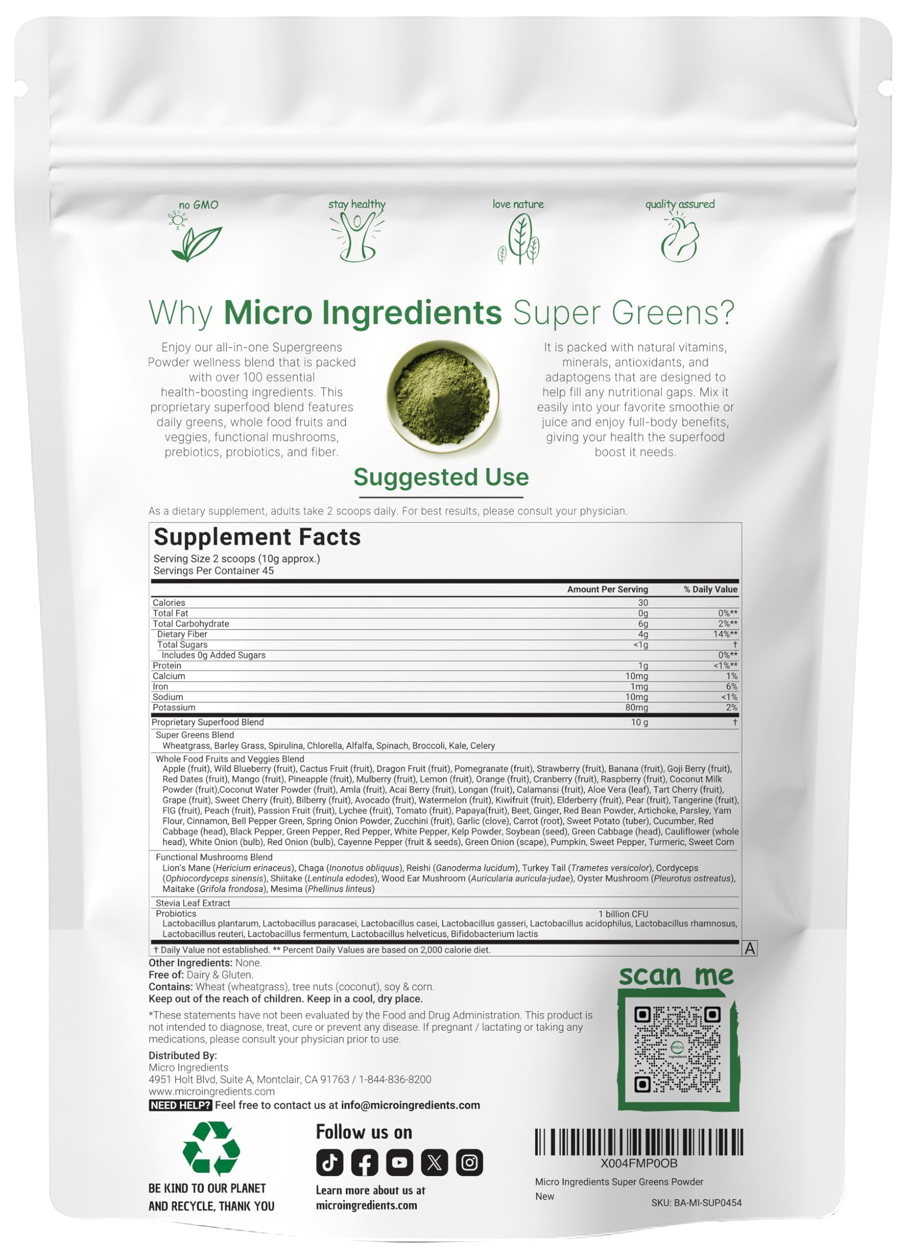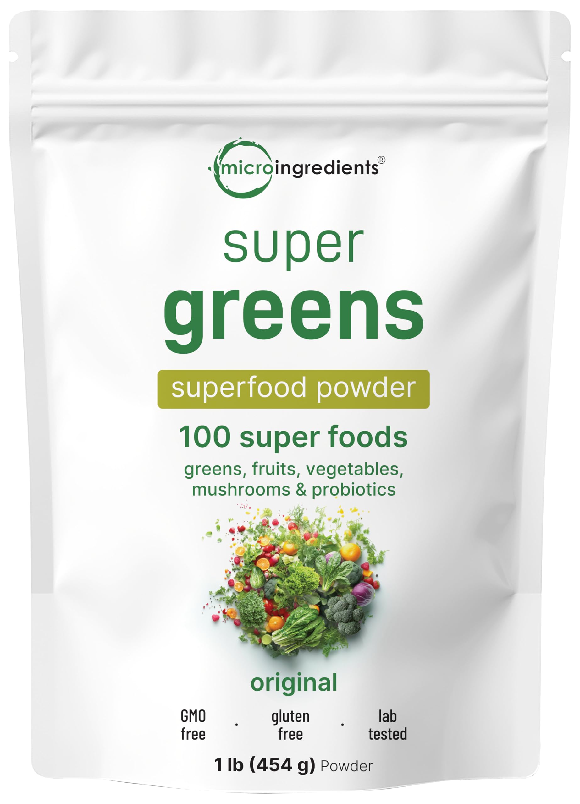 - Micro Ingredients offers a full-spectrum Super Greens Powder in a natural original flavor. A nutrient-dense blend of 100 different superfoods. Includes greens, fruits, vegetables, mushrooms, and probiotics to fill in any nutritional gaps over time.