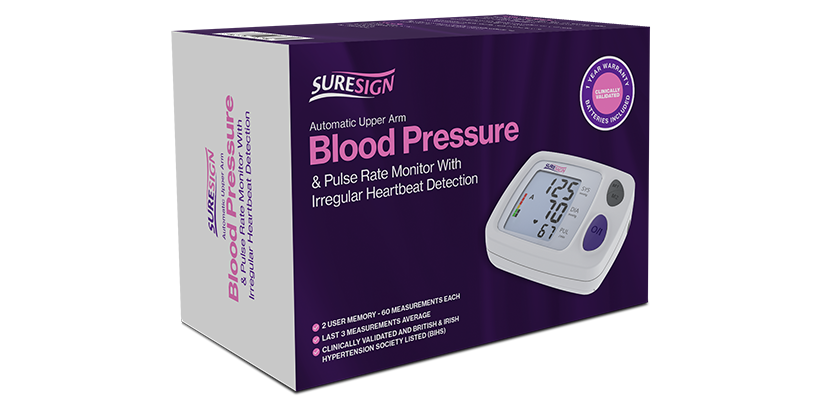 Our Suresign Blood Pressure Monitor is intended for the measurement of Systolic & Diastolic arterial blood pressure. The device measures the fluctuations in the pressure of the cuff produced by extension & contraction of the artery in the arm in response to each heartbeat. These are converted into millimetres of mercury (Hg) & are displayed as a digital value. This monitor also includes an irregular heartbeat detector & WHO classification indicator.
