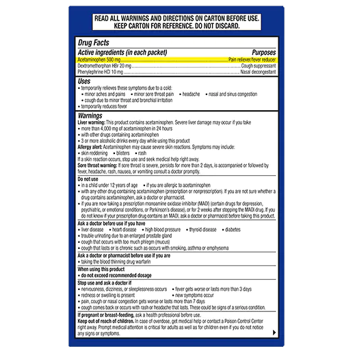 - While experiencing symptoms, take every 4 hours. Do not take more than 6 servings (packets) in 24 hours unless instructed by a healthcare provider. Adults and children aged 12 years and older, dose: 1 packet. Children aged 12 and under, do not use.