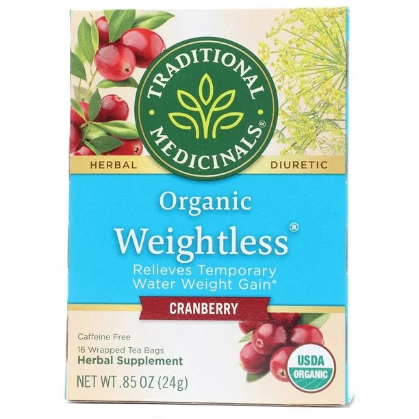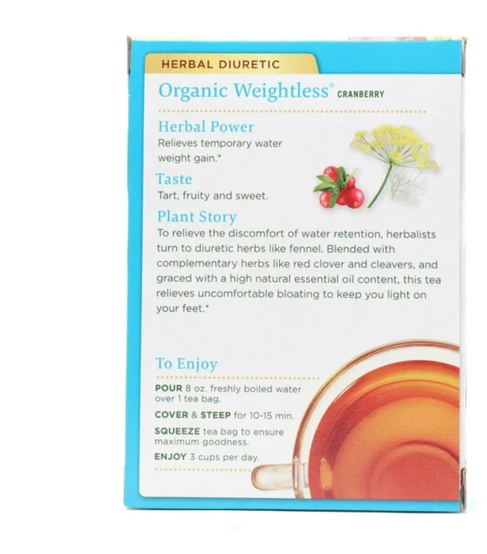 Traditional Medicinals - Organic Weightless Herbal Diuretic Tea Cranberry Flavor - 16 Tea Bags Retaining water can make you feel heavy and bloated. While the last thing on your mind is to drink tea and add more water to your body, this tea contains diuretic herbs which have traditionally been combined to help your body eliminate excess water. Formulated with fennel, parsley, red clover, uva ursi,