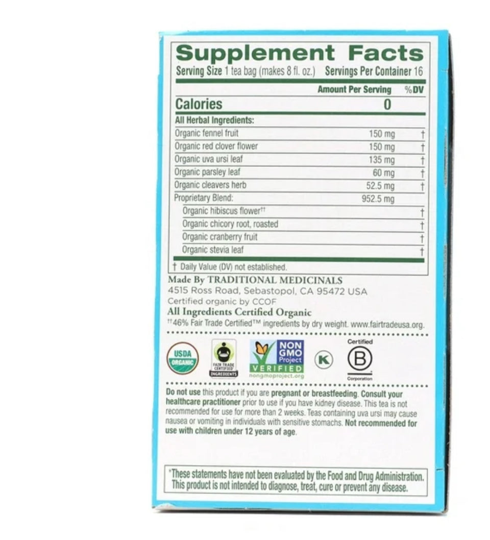 Relieves temporary water weight gain.*Non-GMO Verified. All Ingredients Certified Organic. Kosher. Fair Trade Certified. Caffeine Free.Consistently high-quality herbs from ethical trading partnerships.Taste: Tart, fruity and sweet.Case of six boxes, each box containing 16 sealed tea bags