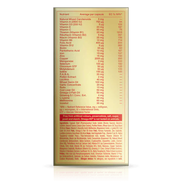 Riboflavin (vitamin B2) and pantothenic acid help to maintain normal energy release; to help maintain energy levels all year round. Omega-H3 also contains vitamins B6 and B12 and iron which contribute to normal red blood cell formation as well as the reduction of tiredness and fatigue.