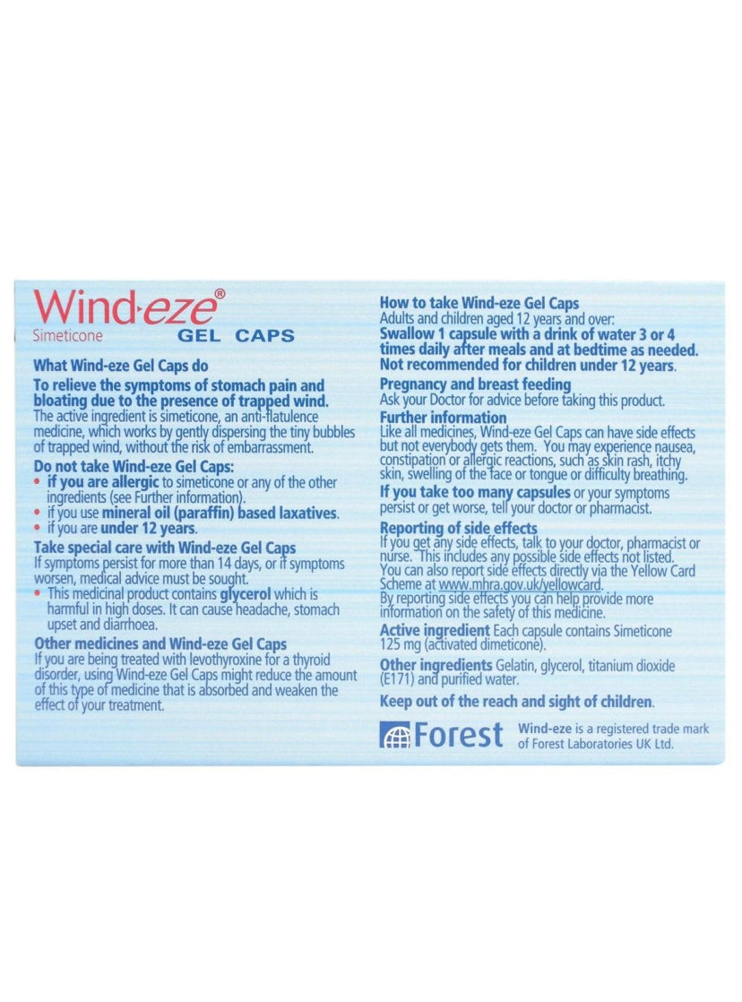 Wind-eze Gel Caps are formulated using Simeticone. This efficient anti-foaming agent reduces the surface area of small gas bubbles within your digestive system, so that they come together to form larger versions, which are much simpler for your body to get rid of. Adults and children aged over 12 can benefit from taking these fast-acting capsules when trapped wind is causing them discomfort.