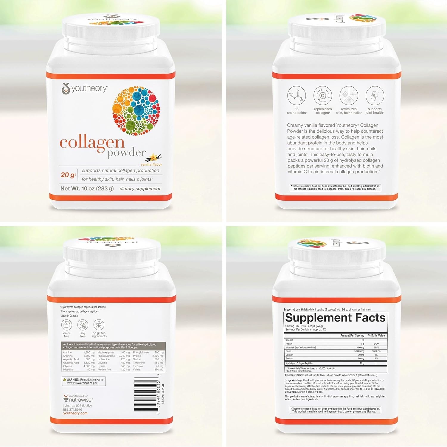 - Collagen Supplement: Youtheory Collagen Powder helps replenish this vital protein to support skin, hair, nails, tendons, and ligaments*