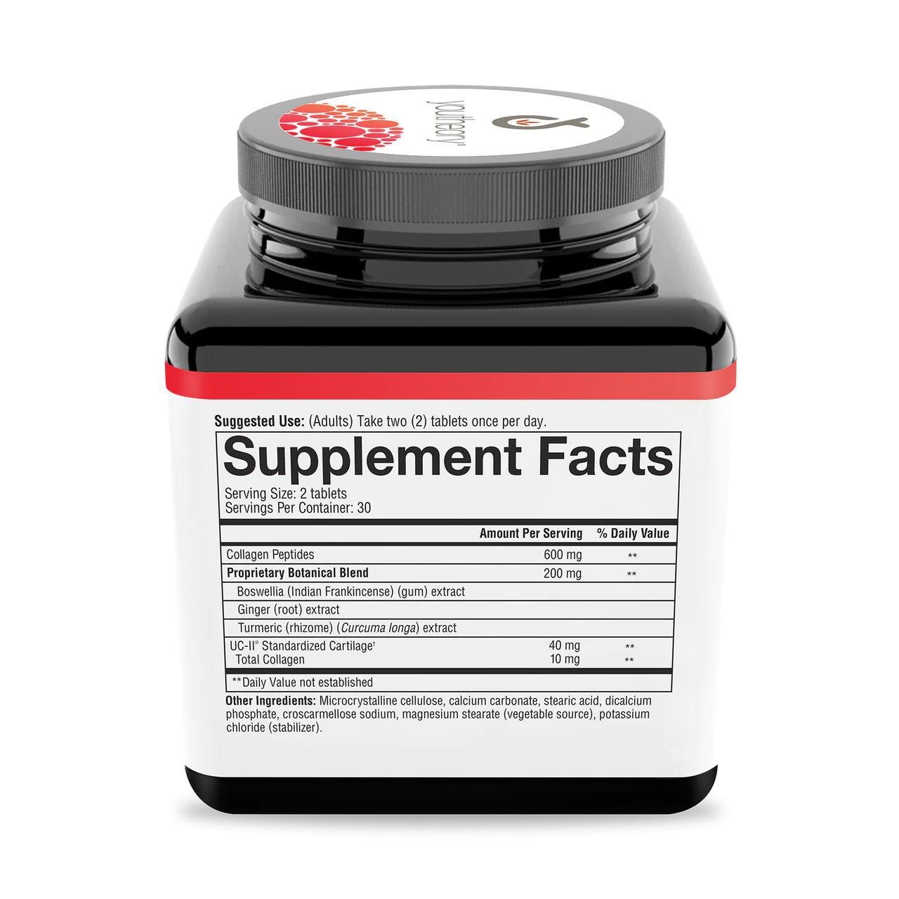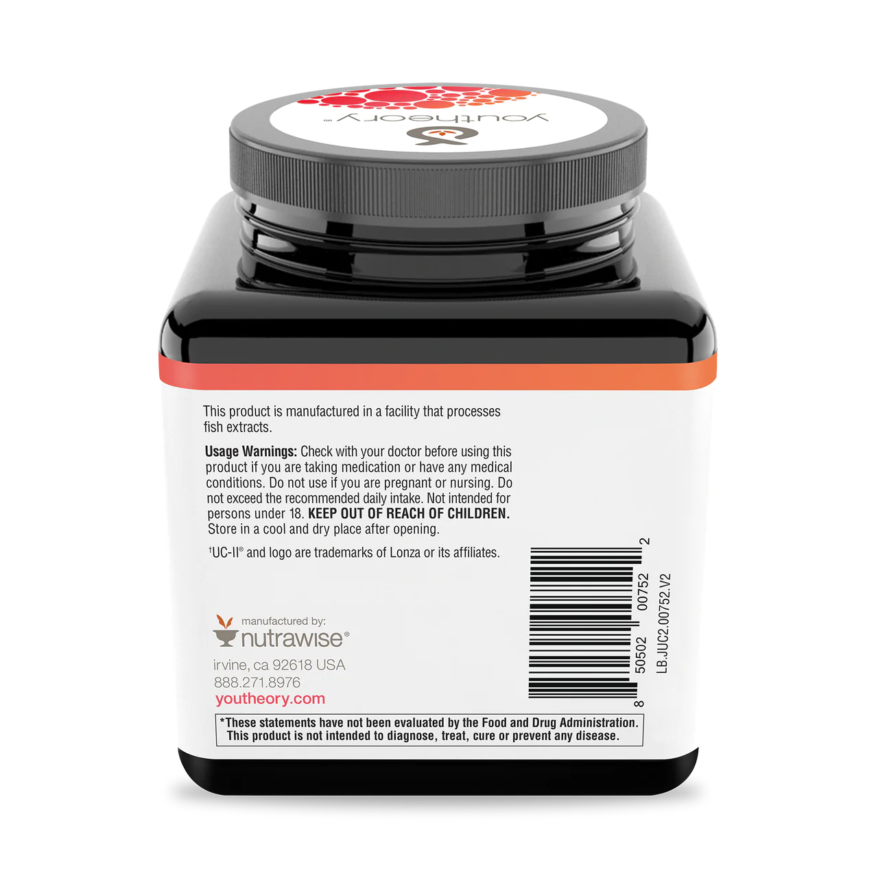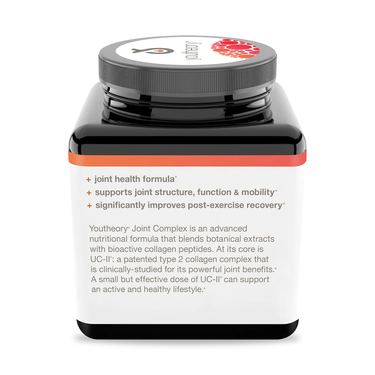 Youtheory® Joint Complex is an advanced nutritional formula that blends botanical extracts with bioactive collagen peptides. At its core is UC-II®: a patented type 2 collagen complex that is clinically-studied for its powerful joint benefits.* A small but effective dose of UC-II® can support an active and healthy lifestyle.*