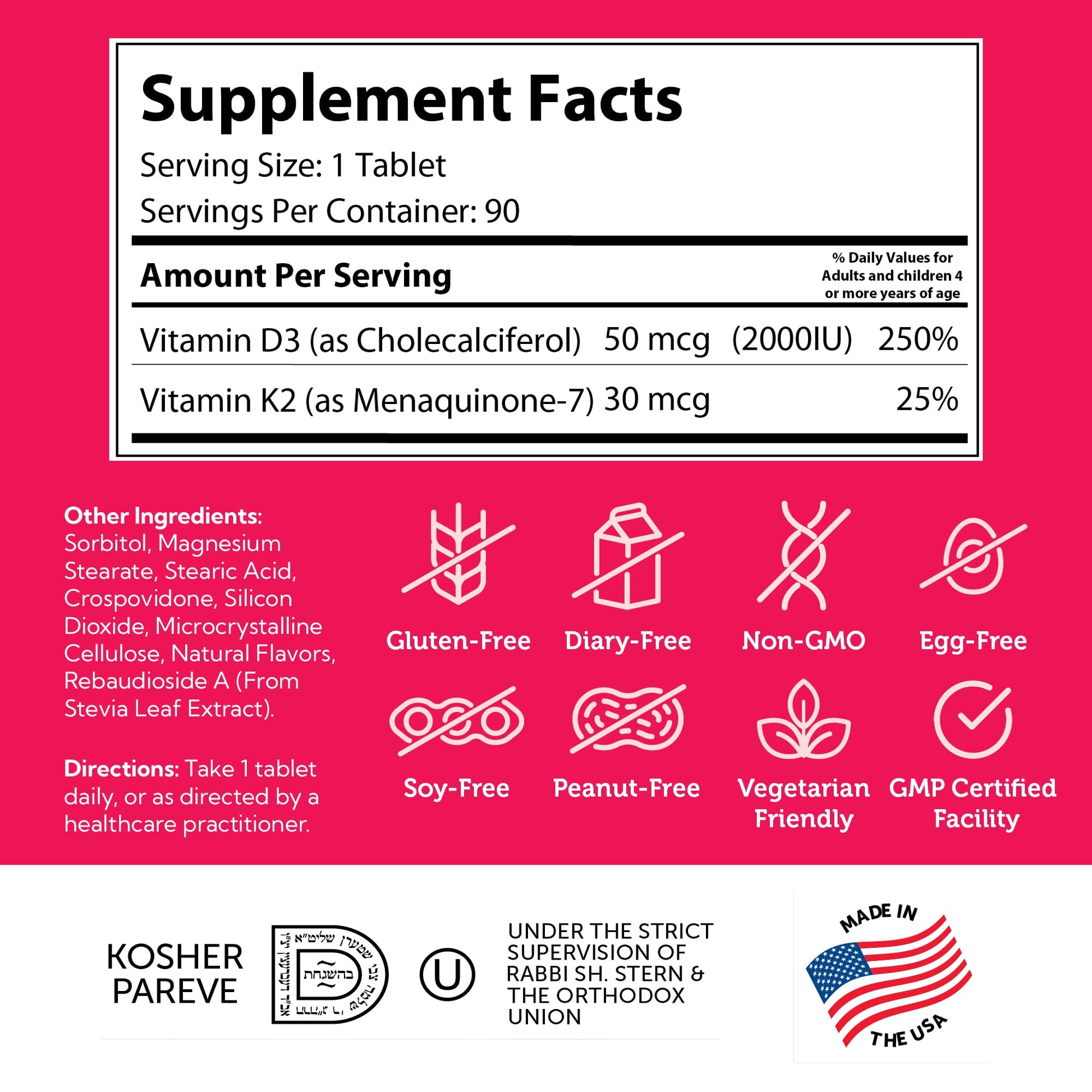 Pre-Order | Arrives in 5–10 Days – Zahler - Junior Vitamin D3 + K2 Chewable Tablets for Kids| Vitamin D for Kids 2000 IU | Delicious Vitamin D K2 Chews to Support Healthy Bones & Teeth - Kosher, Less Sugar Than Gummies (90 Count)